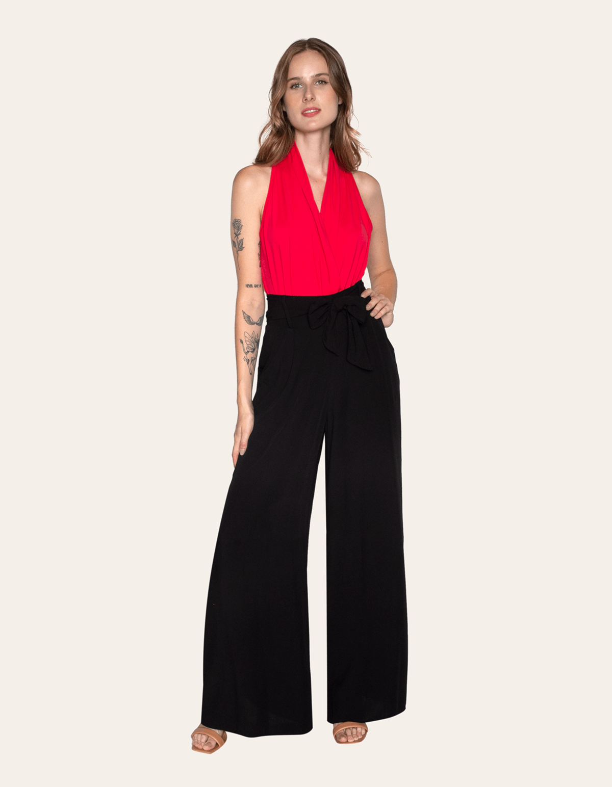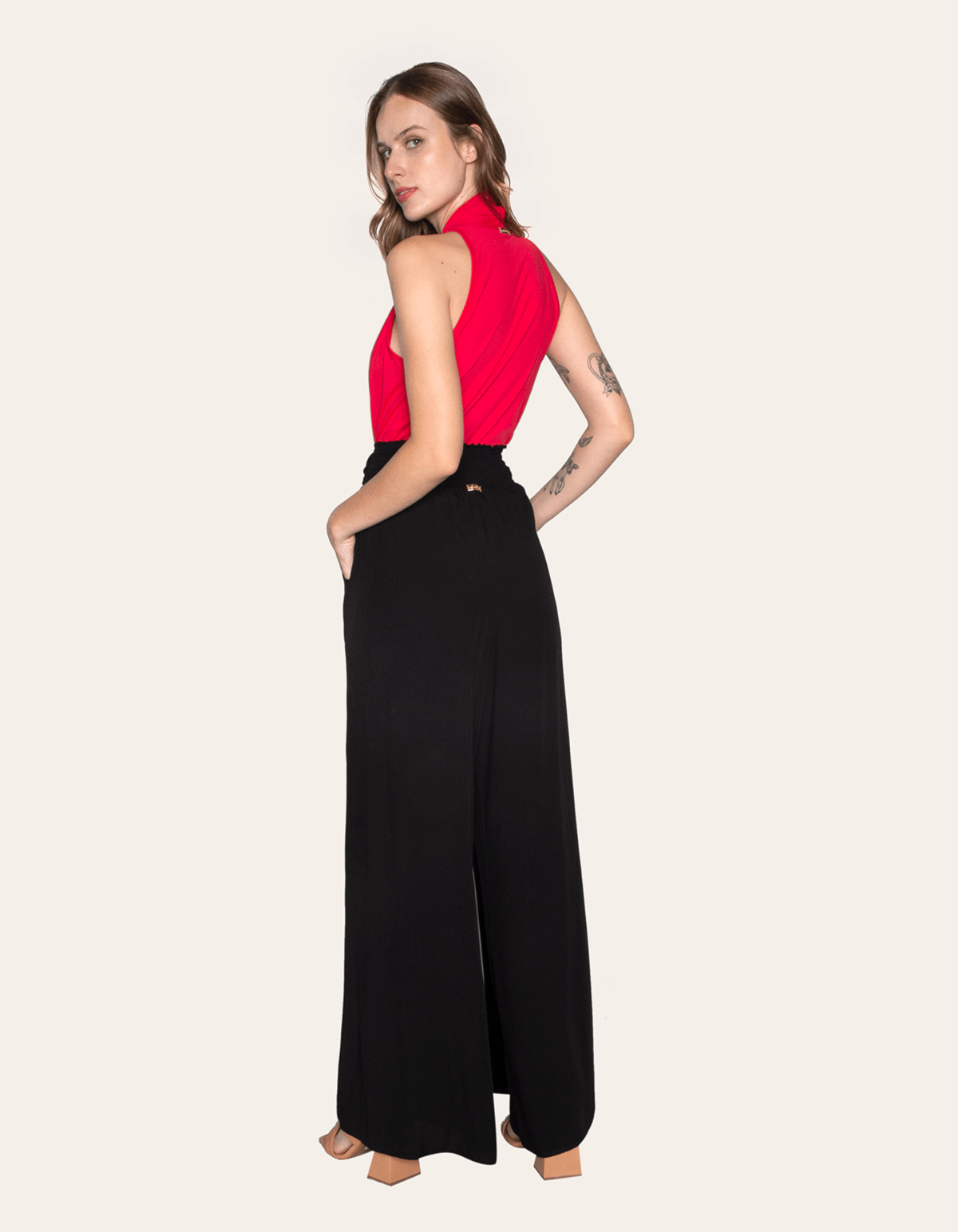 Apresentamos uma calça pantalona de cintura alta com faixa para amarrar, bolsos e elástico no cós na parte de trás. esta peça combina estilo e funcionalidade, permitindo ajuste personalizado com a faixa e garantindo conforto com o elástico. os bolsos laterais acrescentam praticidade ao design. ideal para ocasiões casuais ou especiais, oferecendo um visual contemporâneo com máximo conforto.