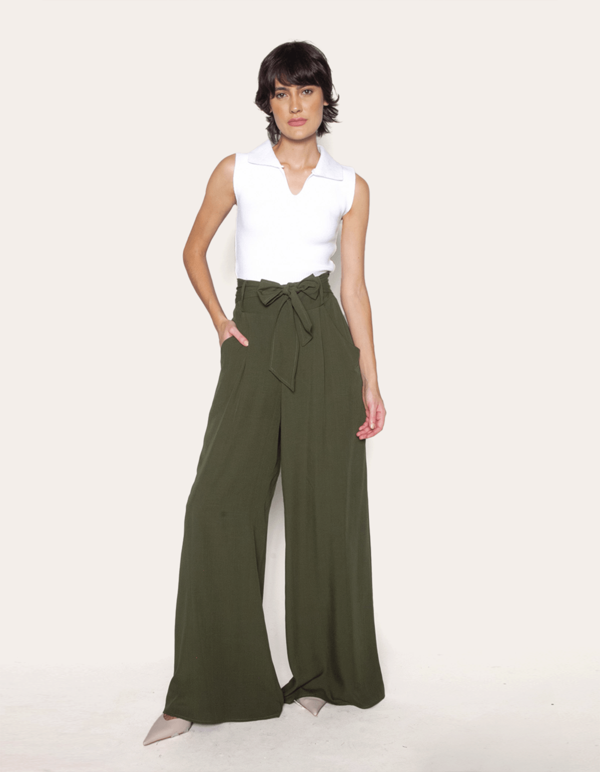 Apresentamos uma calça pantalona de cintura alta com faixa para amarrar, bolsos e elástico no cós na parte de trás. esta peça combina estilo e funcionalidade, permitindo ajuste personalizado com a faixa e garantindo conforto com o elástico. os bolsos laterais acrescentam praticidade ao design. ideal para ocasiões casuais ou especiais, oferecendo um visual contemporâneo com máximo conforto.