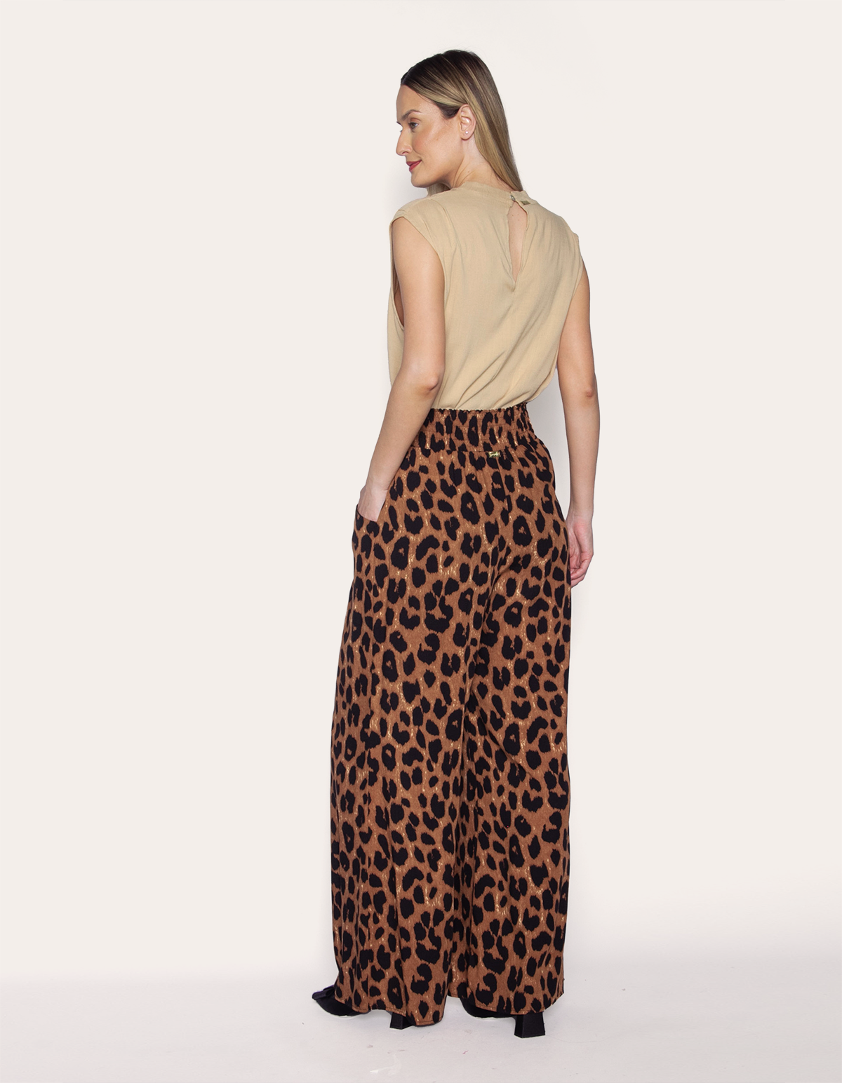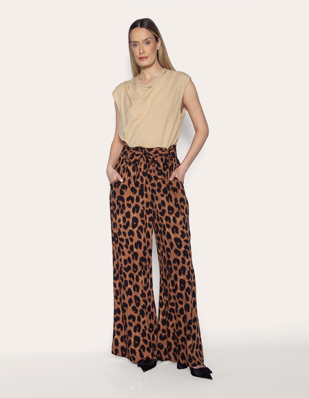 Apresentamos uma calça pantalona de cintura alta com faixa para amarrar, bolsos e elástico no cós na parte de trás. esta peça combina estilo e funcionalidade, permitindo ajuste personalizado com a faixa e garantindo conforto com o elástico. os bolsos laterais acrescentam praticidade ao design. ideal para ocasiões casuais ou especiais, oferecendo um visual contemporâneo com máximo conforto.