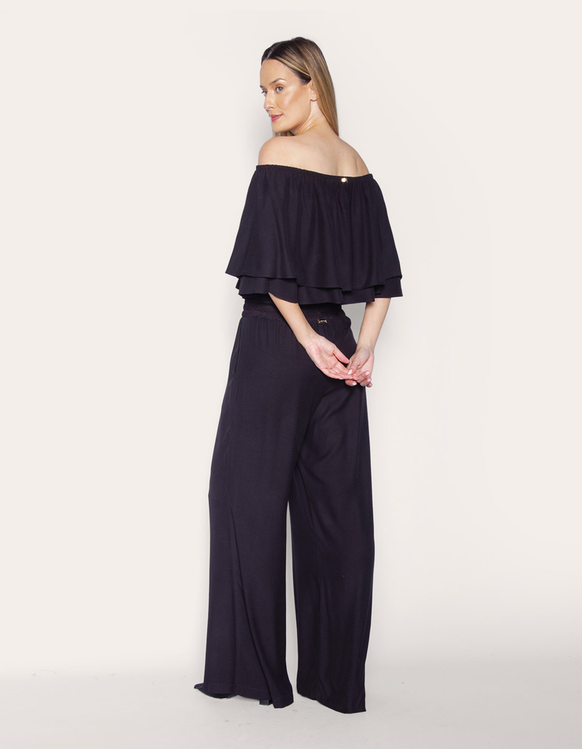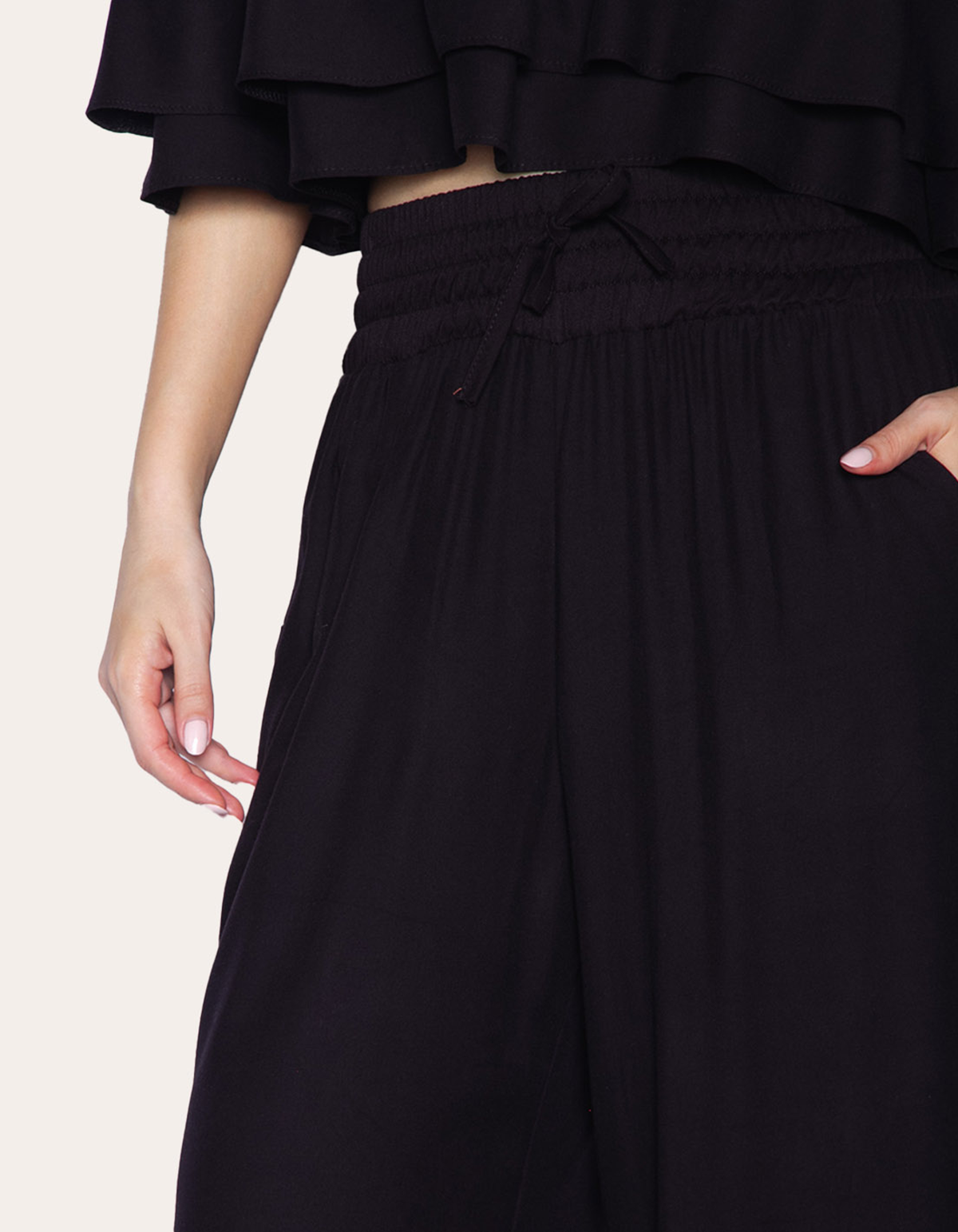 Calça pantalona cintura alta com elástico. perfeita para quem busca glamour e estilo sem abrir mão do conforto e da praticidade.