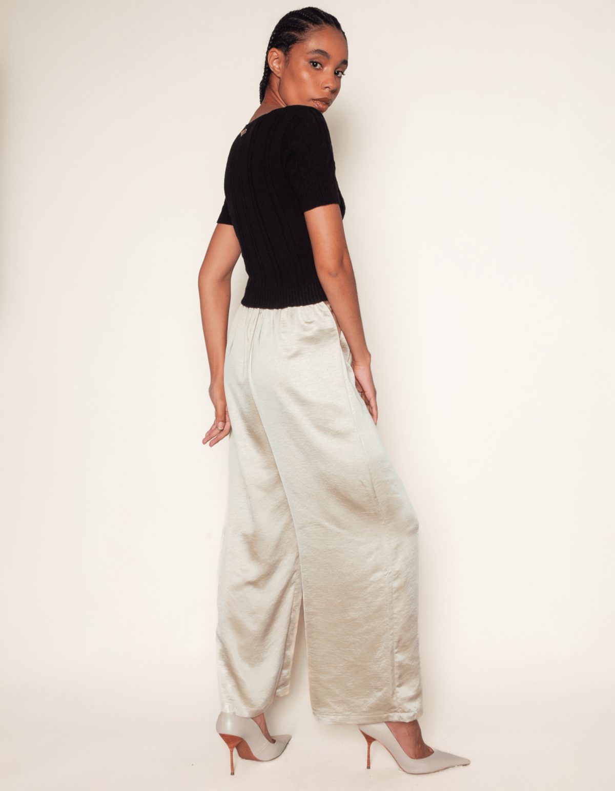 Calça pantalona cetim com transpasse amarração na frente e cintura com elástico atrás. para um look moderno e casual, seja você, se destaque!!!