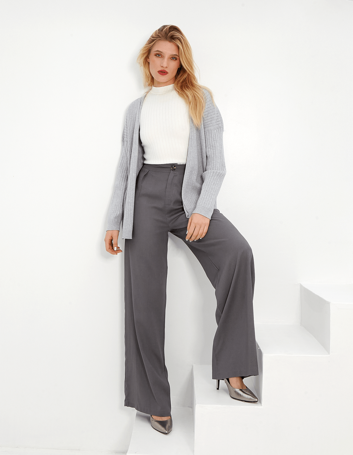 Calça modelagem pantalona, possui bolsos facas nas laterais e bolsos atrás, seu fechamento é por zíper e botão. esbanja elegância por onde passa.