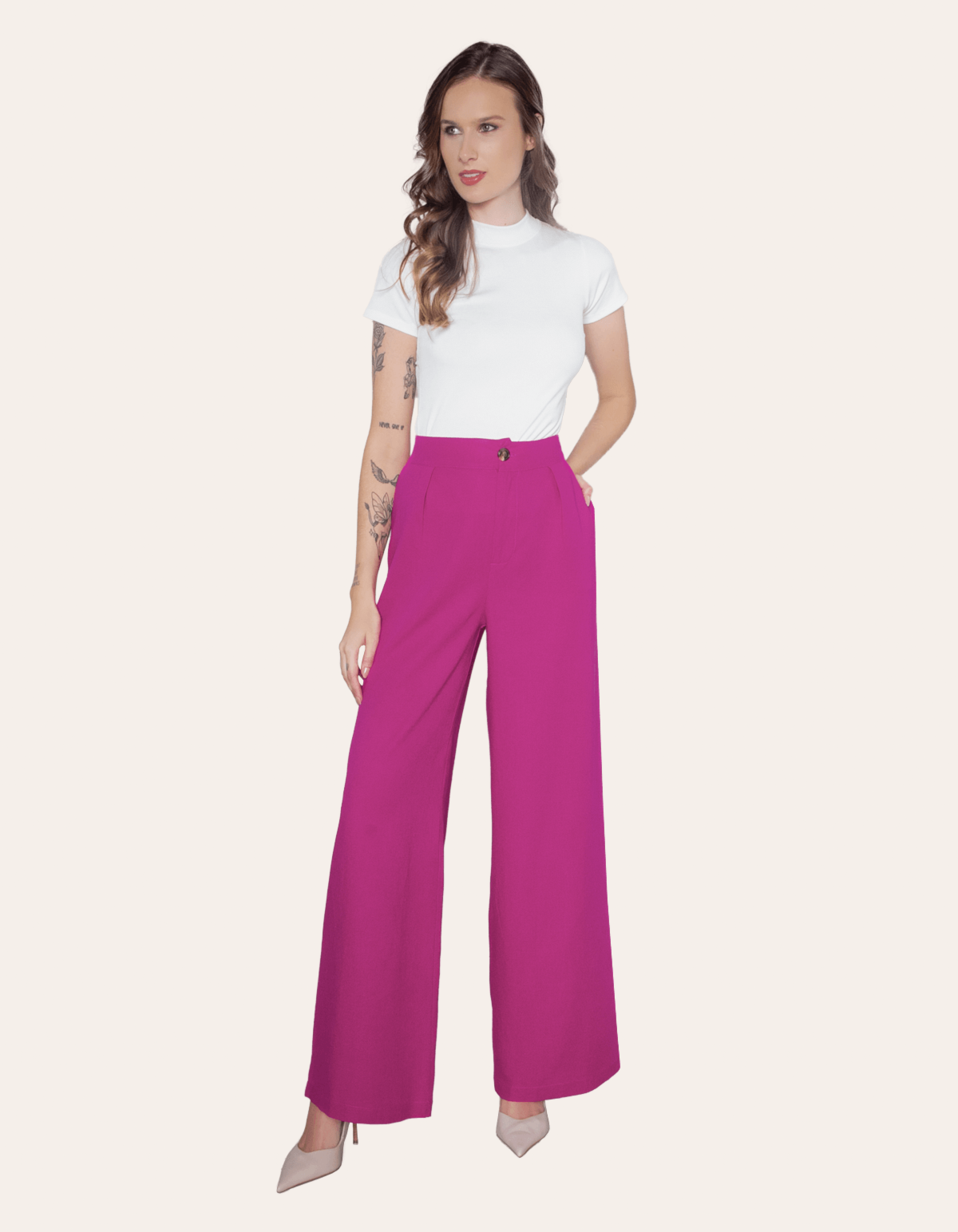 Calça modelagem pantalona, possui bolsos facas nas laterais e bolsos atrás, seu fechamento é por zíper e botão. esbanja elegância por onde passa.