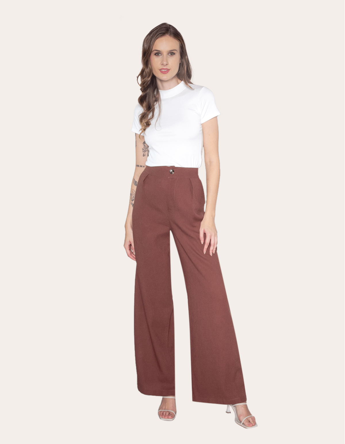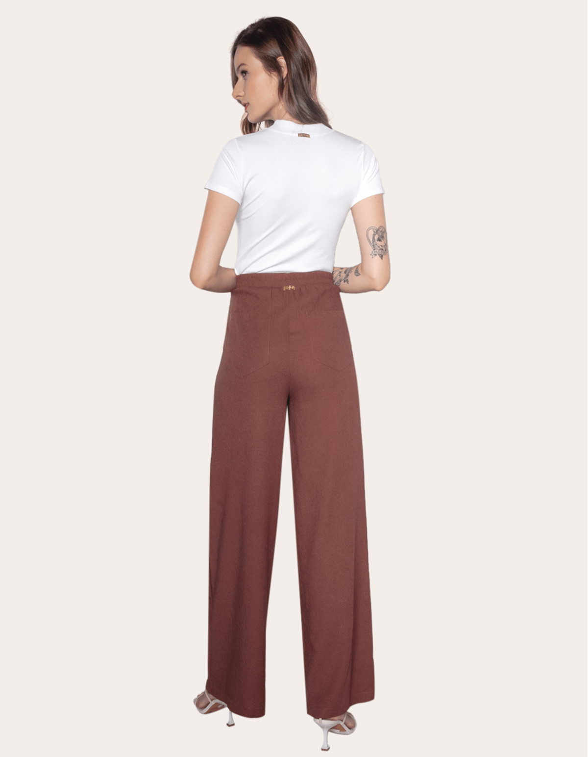 Calça modelagem pantalona, possui bolsos facas nas laterais e bolsos atrás, seu fechamento é por zíper e botão. esbanja elegância por onde passa.