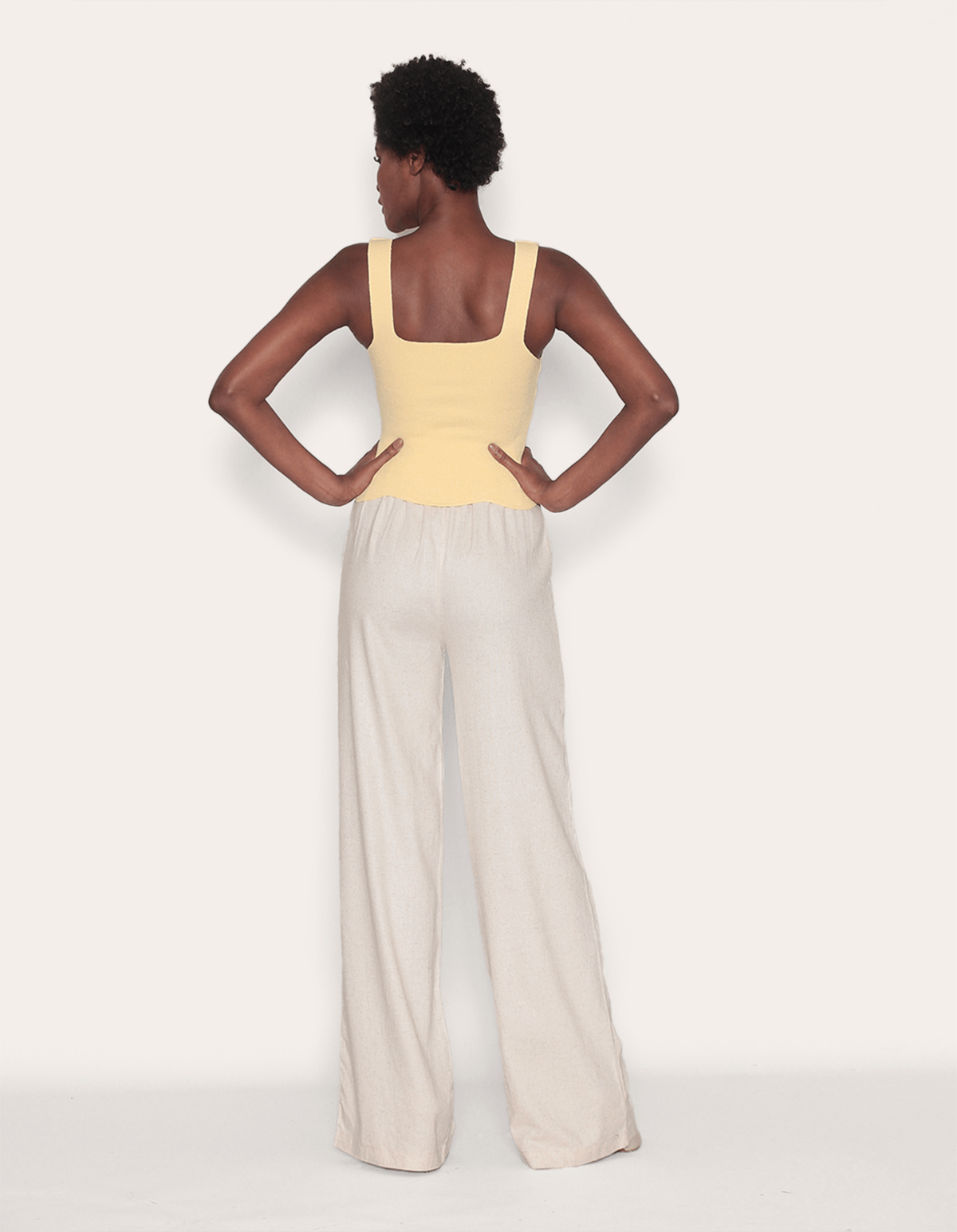 Calça de linho modelo pantalona alfaiataria, com elástico atrás, botões decorativos na frente, e bolsos laterais. charmosa e muito delicada, a peça é um curinga na hora de escolher um look para arrasar, passível de inúmeras combinações, é perfeita para usar em qualquer ocasião.