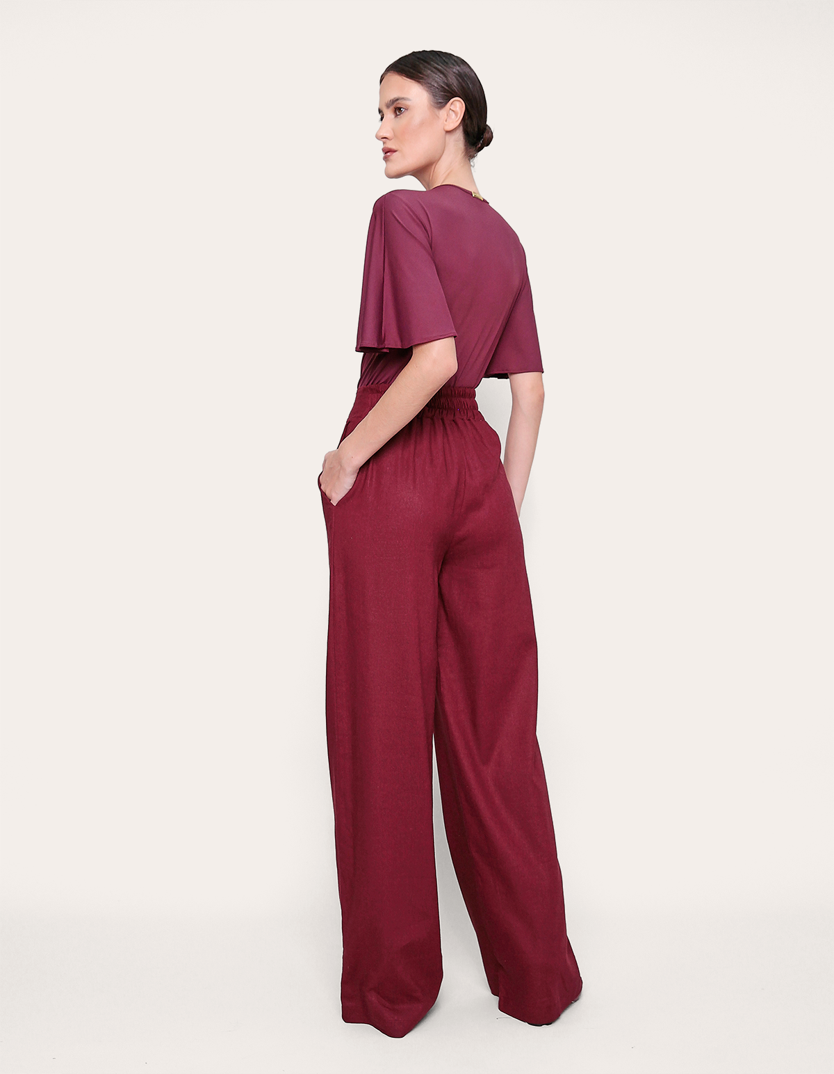 Calça de linho modelo pantalona alfaiataria, com elástico atrás, botões decorativos na frente, e bolsos laterais. charmosa e muito delicada, a peça é um curinga na hora de escolher um look para arrasar, passível de inúmeras combinações, é perfeita para usar em qualquer ocasião.