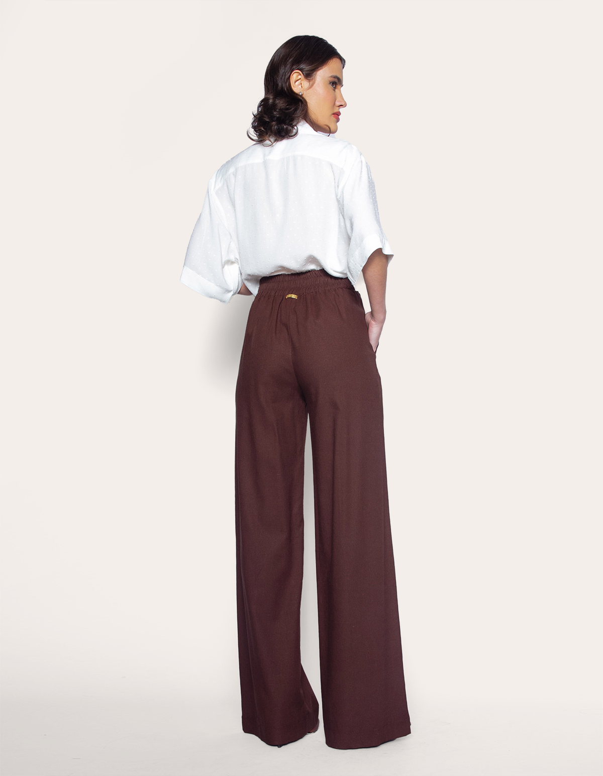 Calça de linho modelo pantalona alfaiataria, com elástico atrás, botões decorativos na frente, e bolsos laterais. charmosa e muito delicada, a peça é um curinga na hora de escolher um look para arrasar, passível de inúmeras combinações, é perfeita para usar em qualquer ocasião.