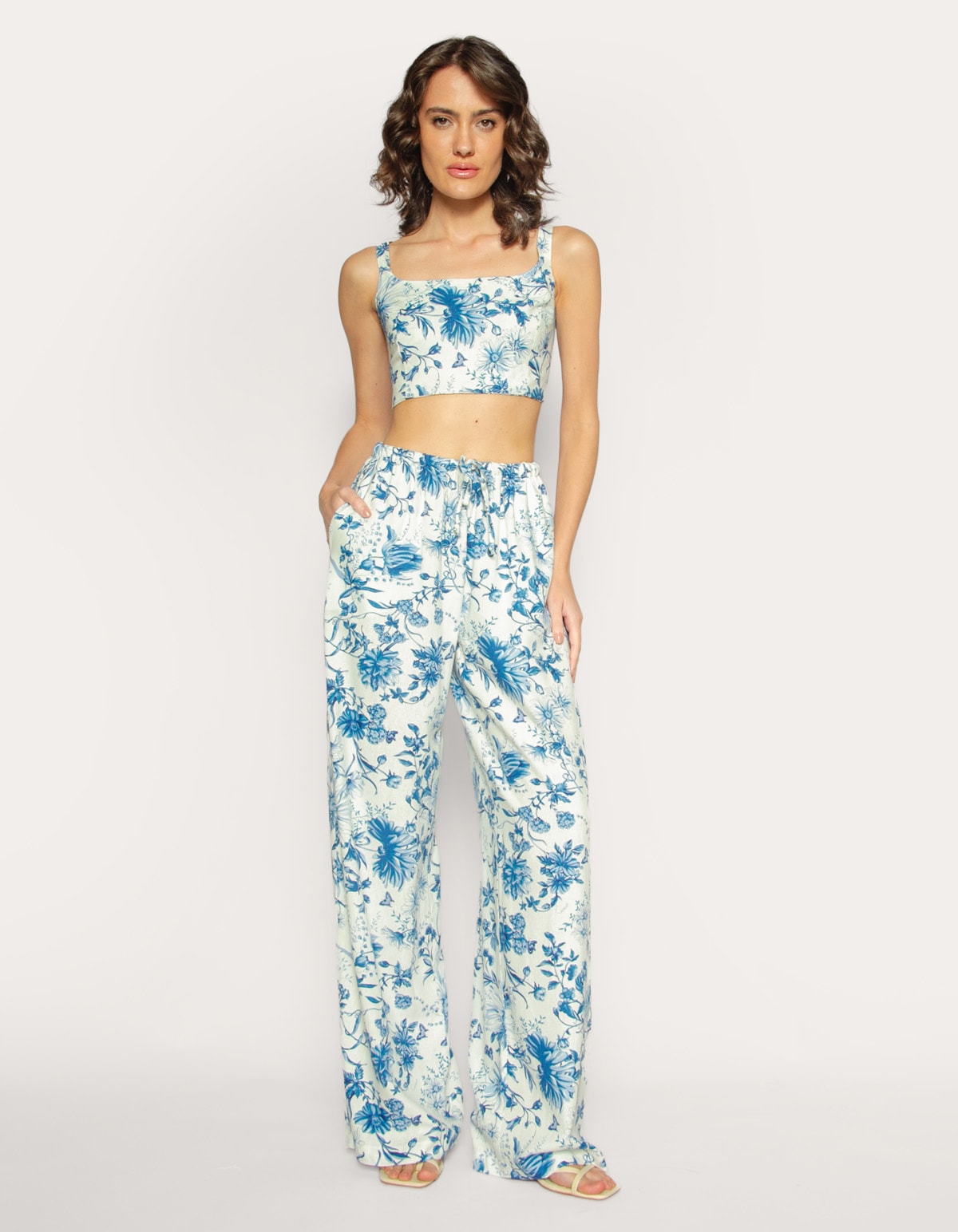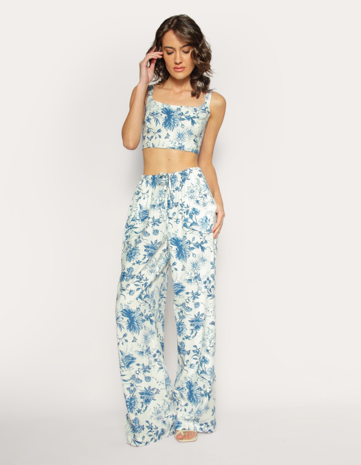 Calça pantalona de amarrar estampada. De corte largo e fluido, proporcionando um visual confortável e casual. Possui elástico na cintura, com cordão ajustável para um melhor ajuste. Sugere um estilo ideal para climas mais quentes ou momentos de relaxamento.