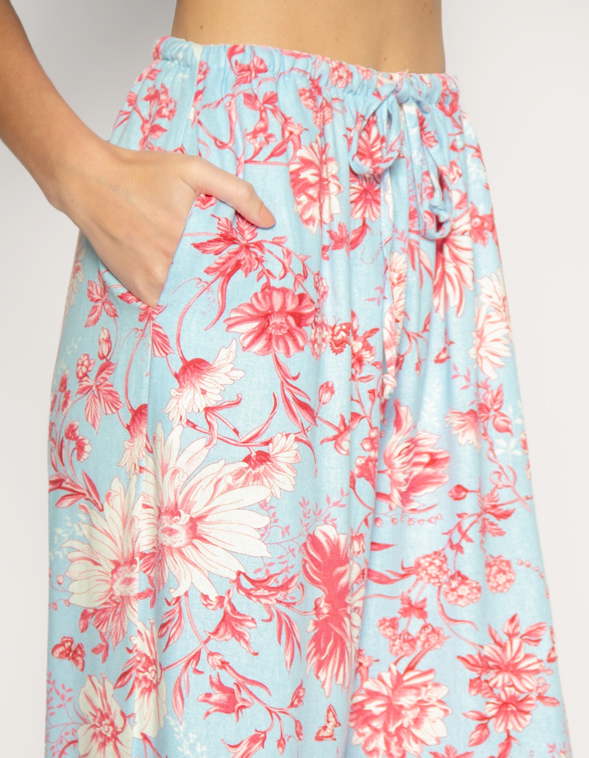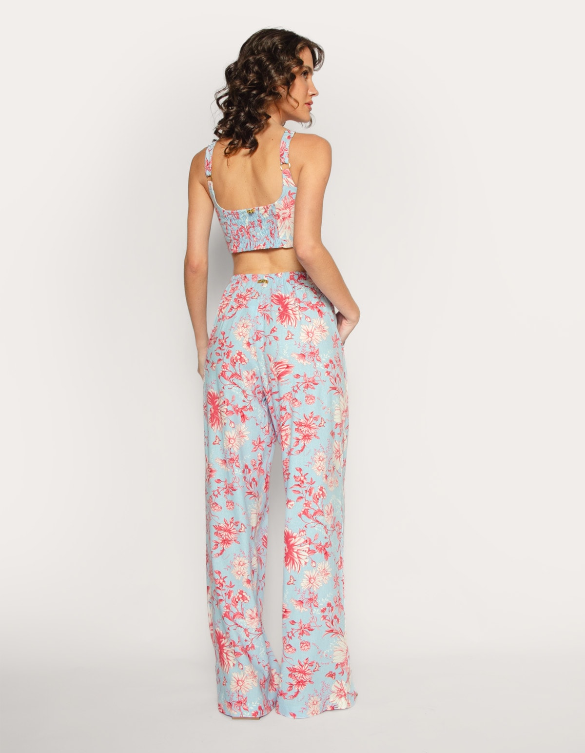 Calça pantalona de amarrar estampada. De corte largo e fluido, proporcionando um visual confortável e casual. Possui elástico na cintura, com cordão ajustável para um melhor ajuste. Sugere um estilo ideal para climas mais quentes ou momentos de relaxamento.