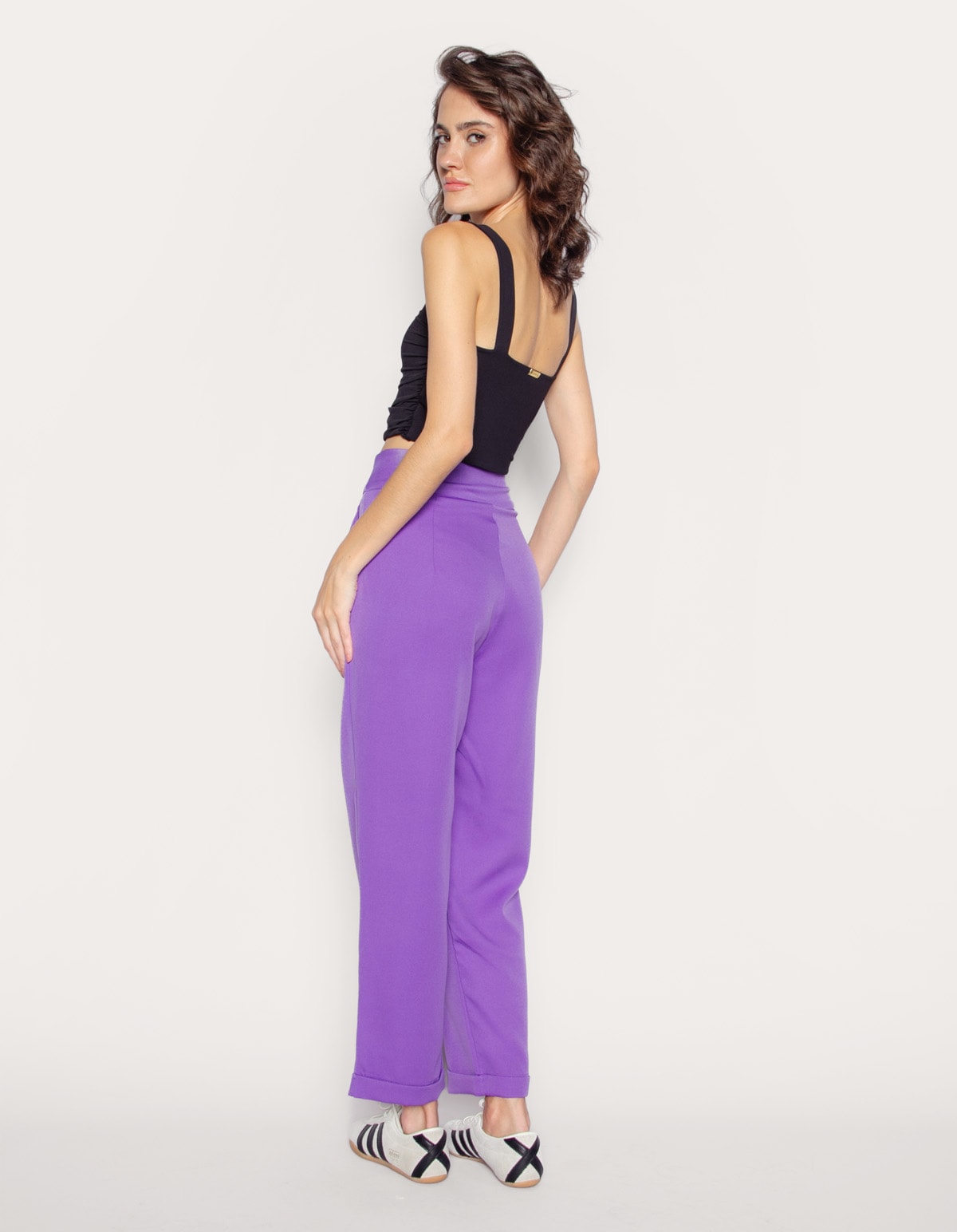 Calça alfaiataria com parte de cima mais larga e mais fina em direção ao tornozelo. nos anos 90, era conhecida como semibag, com pregas na cintura, gancho mais baixo e cintura mais alta.. o modelo tem dois bolsos facas laterais. cós com gancho no lugar e fechamento frontal por zíper e velcro. a barra tem acabamento dobrado.