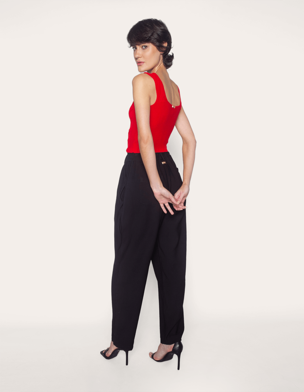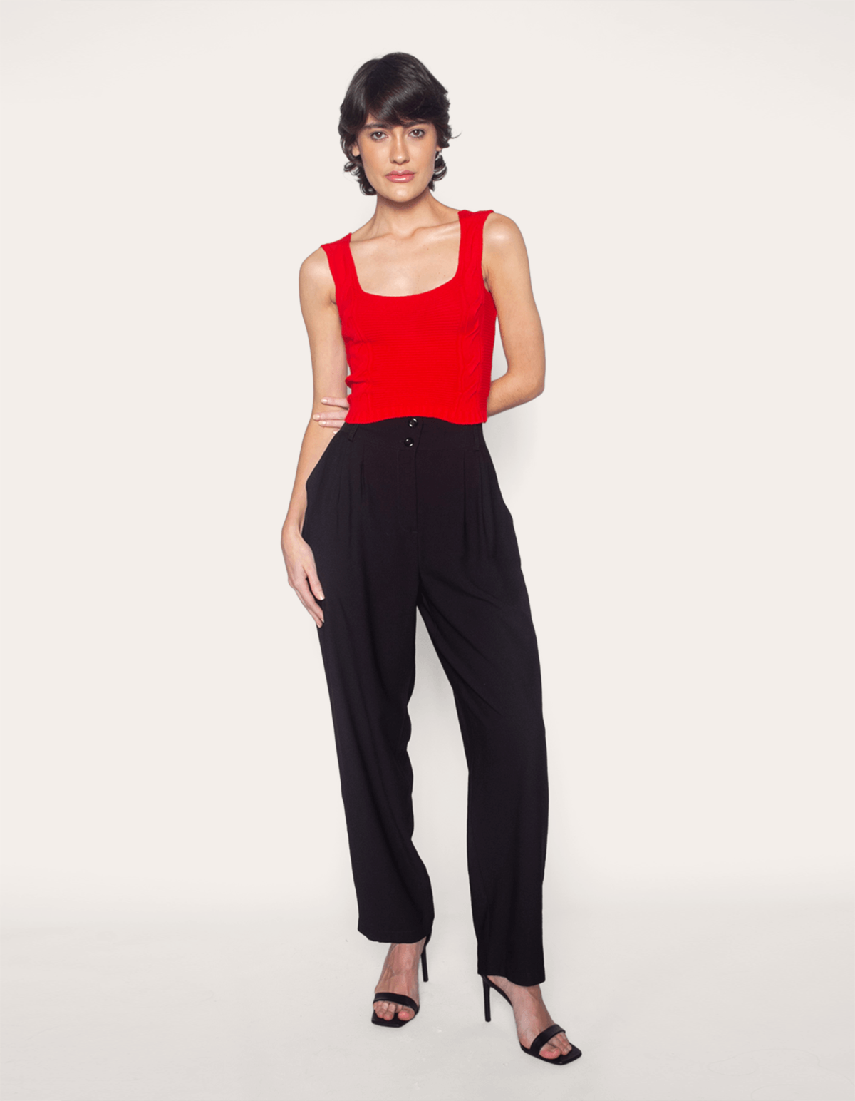 Calça reta alfaiataria, cós com elástico atrás. possui bolsos na frente e atrás, fechamento por zíper e 2 botões na frente. a calça reta é um clássico da moda e uma peça muito versátil, que se encaixa em diferentes estilos e compõe desde looks básicos, até visuais mais complexos. ela possui modelagem reta e levemente ampla, com uma leve abertura na altura do joelho até a barra. podemos dizer que sua modelagem fica entre a calça skinny e a pantalona, trazendo esse ar mais clássico.