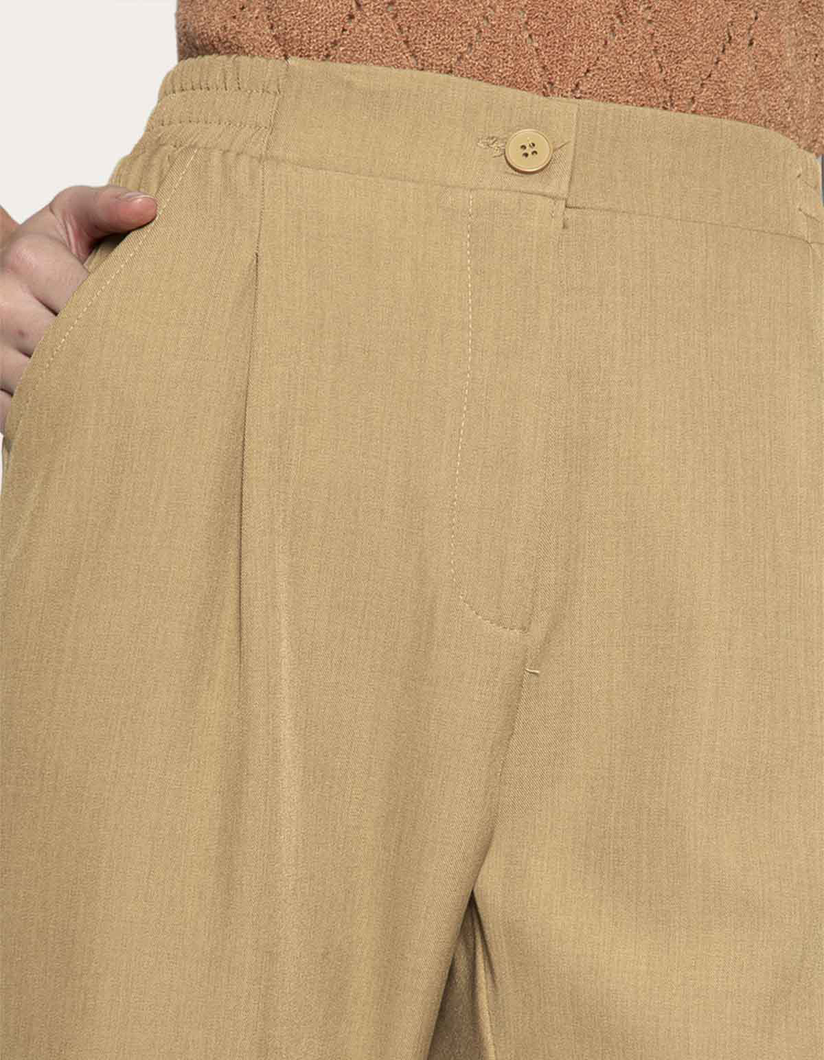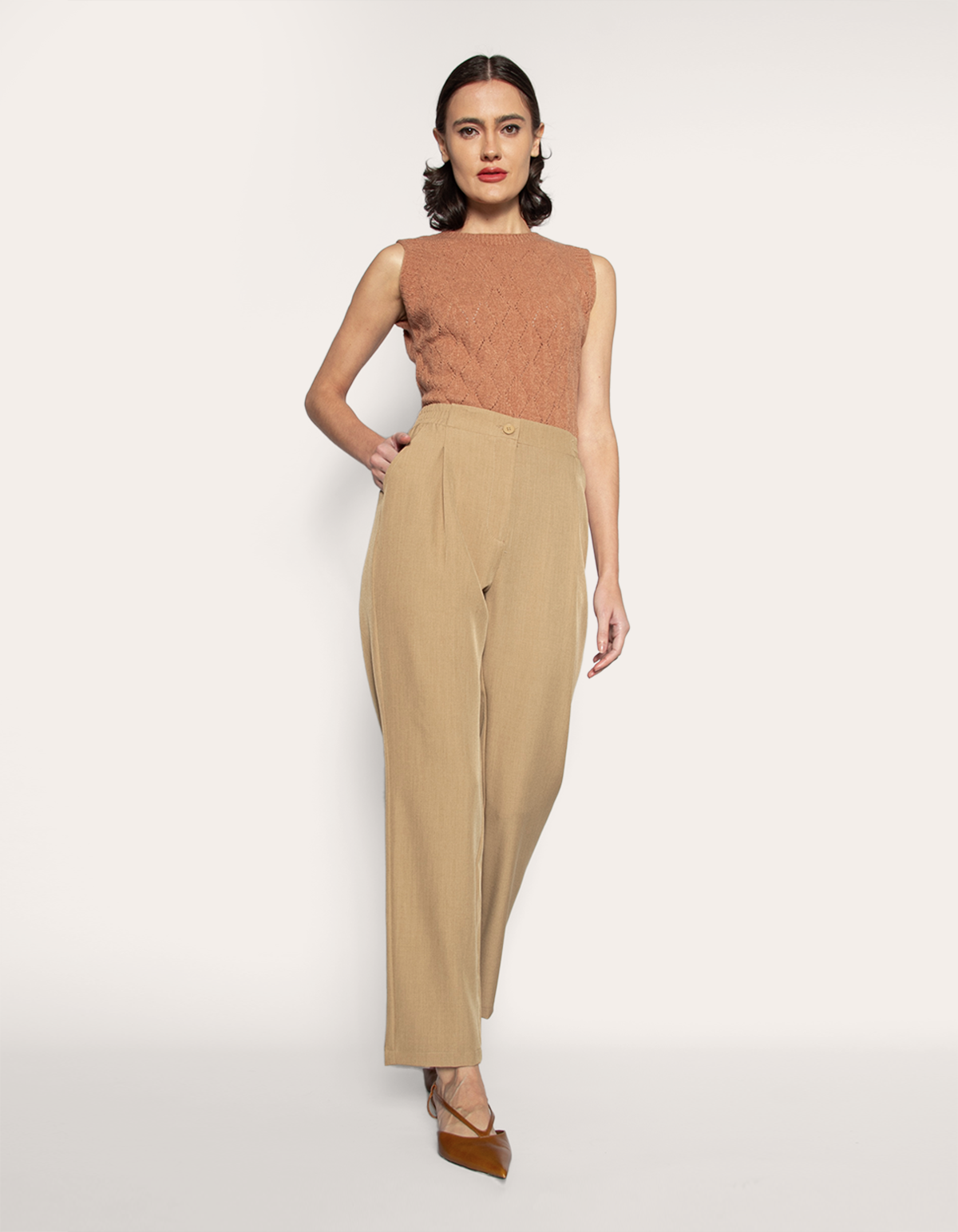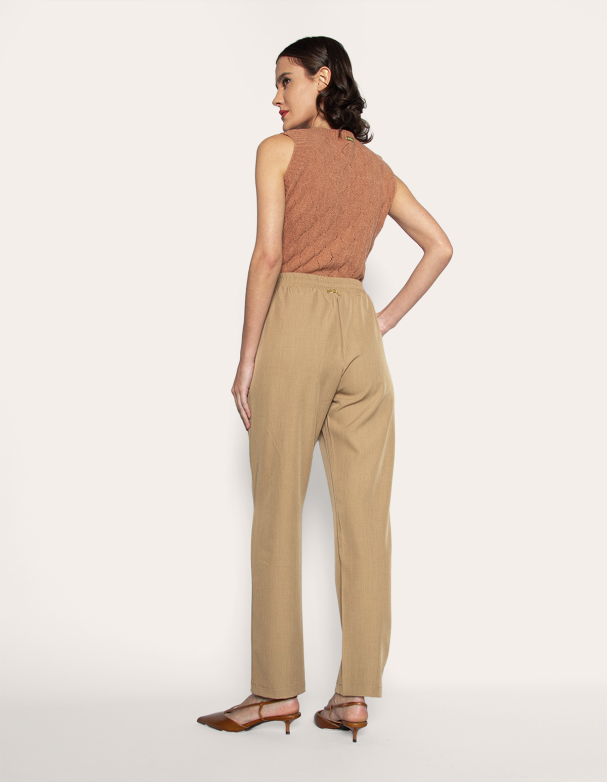 A calça reta alfaiataria é uma fusão perfeita entre elegância e conforto. Com ziper frontal e botão para fechamento, apresenta detalhes refinados. O cós com elástico começando nas laterais da frente e atrás permite ajuste ideal a cintura, oferecendo versatilidade ao visual. As pregas frontais proporcionam um caimento impecável, valorizando a silhueta feminina. Ideal para criar looks sofisticados sem abrir mão do conforto.