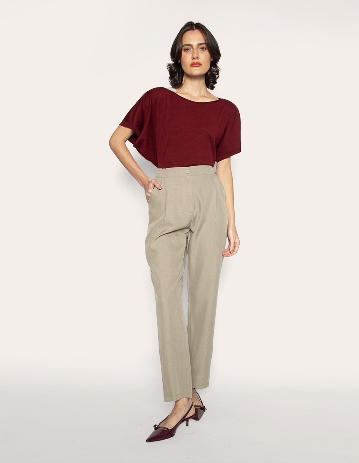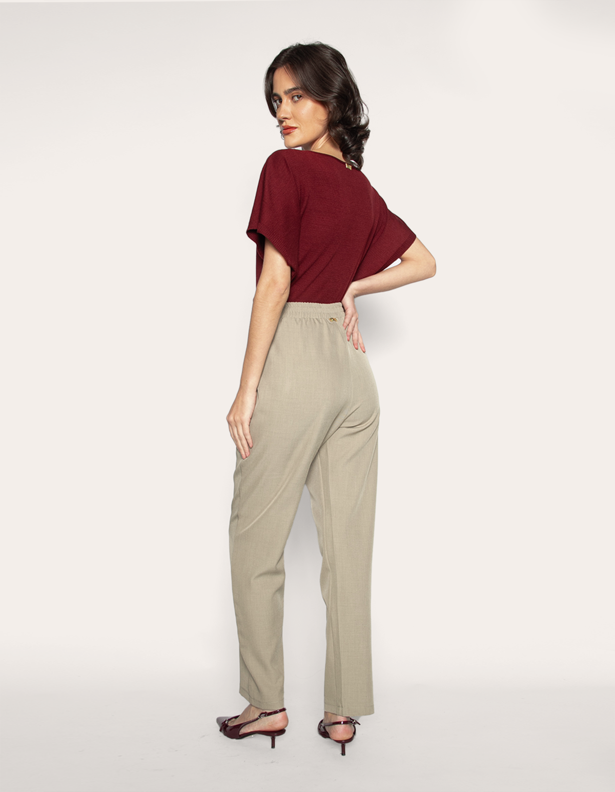 A calça reta alfaiataria é uma fusão perfeita entre elegância e conforto. Com ziper frontal e botão para fechamento, apresenta detalhes refinados. O cós com elástico começando nas laterais da frente e atrás permite ajuste ideal a cintura, oferecendo versatilidade ao visual. As pregas frontais proporcionam um caimento impecável, valorizando a silhueta feminina. Ideal para criar looks sofisticados sem abrir mão do conforto.