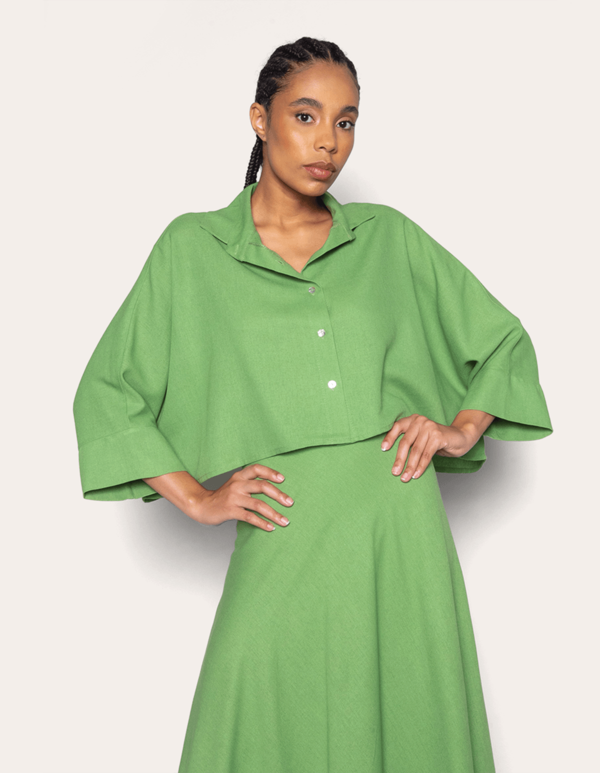 Camisa confeccionada em tecido plano de viscolinho com leve transparência. a modelagem cropped tem comprimento curto, enquanto o caimento é solto e amplo. o modelo tem mangas curtas amplas, gola com lapela e vista frontal de botões. uma peça que valoriza o corpo e traz leveza à estação com um toque de sofisticação ao visual. calça pantalona, skinny, wide leg ou shorts: escolha a sua combinação favorita e crie um look único!
