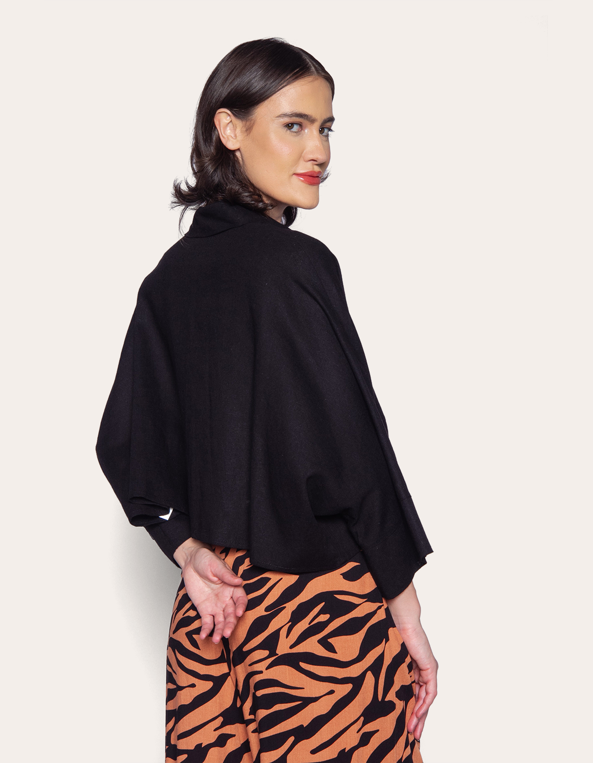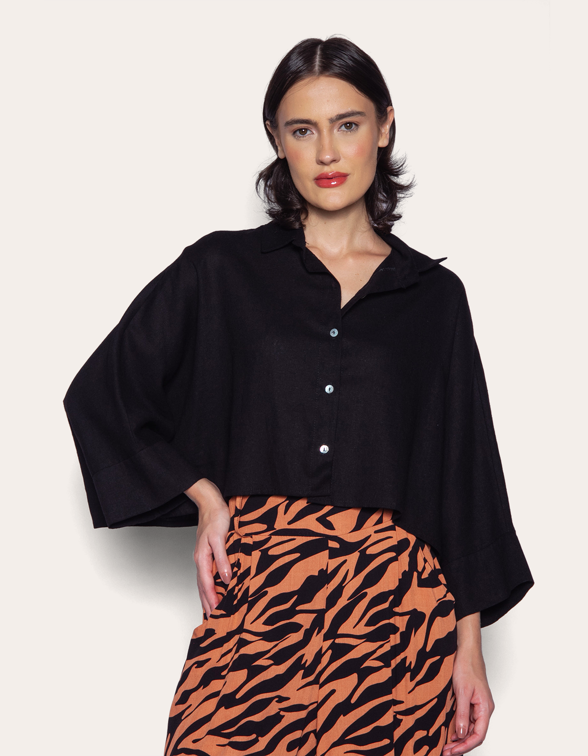 Camisa confeccionada em tecido plano de viscolinho com leve transparência. a modelagem cropped tem comprimento curto, enquanto o caimento é solto e amplo. o modelo tem mangas curtas amplas, gola com lapela e vista frontal de botões. uma peça que valoriza o corpo e traz leveza à estação com um toque de sofisticação ao visual. calça pantalona, skinny, wide leg ou shorts: escolha a sua combinação favorita e crie um look único!