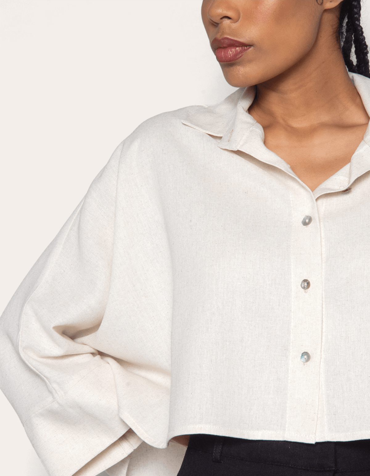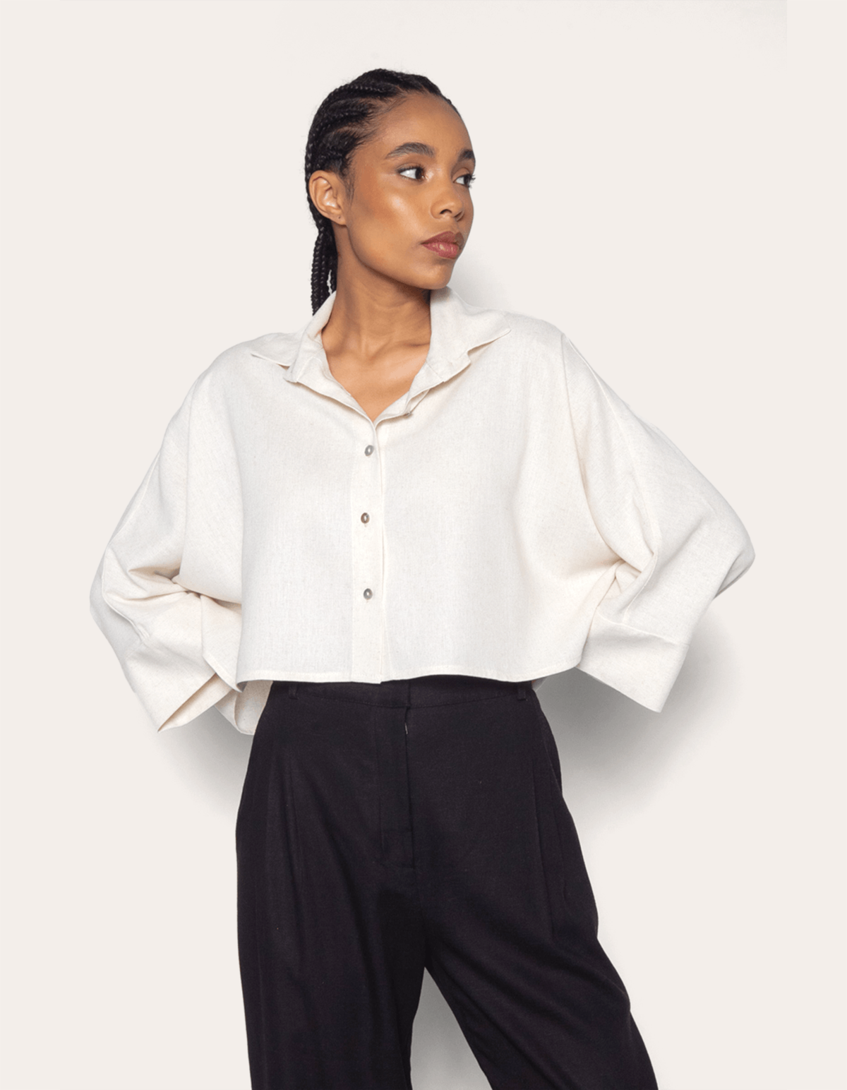 Camisa confeccionada em tecido plano de viscolinho com leve transparência. a modelagem cropped tem comprimento curto, enquanto o caimento é solto e amplo. o modelo tem mangas curtas amplas, gola com lapela e vista frontal de botões. uma peça que valoriza o corpo e traz leveza à estação com um toque de sofisticação ao visual. calça pantalona, skinny, wide leg ou shorts: escolha a sua combinação favorita e crie um look único!