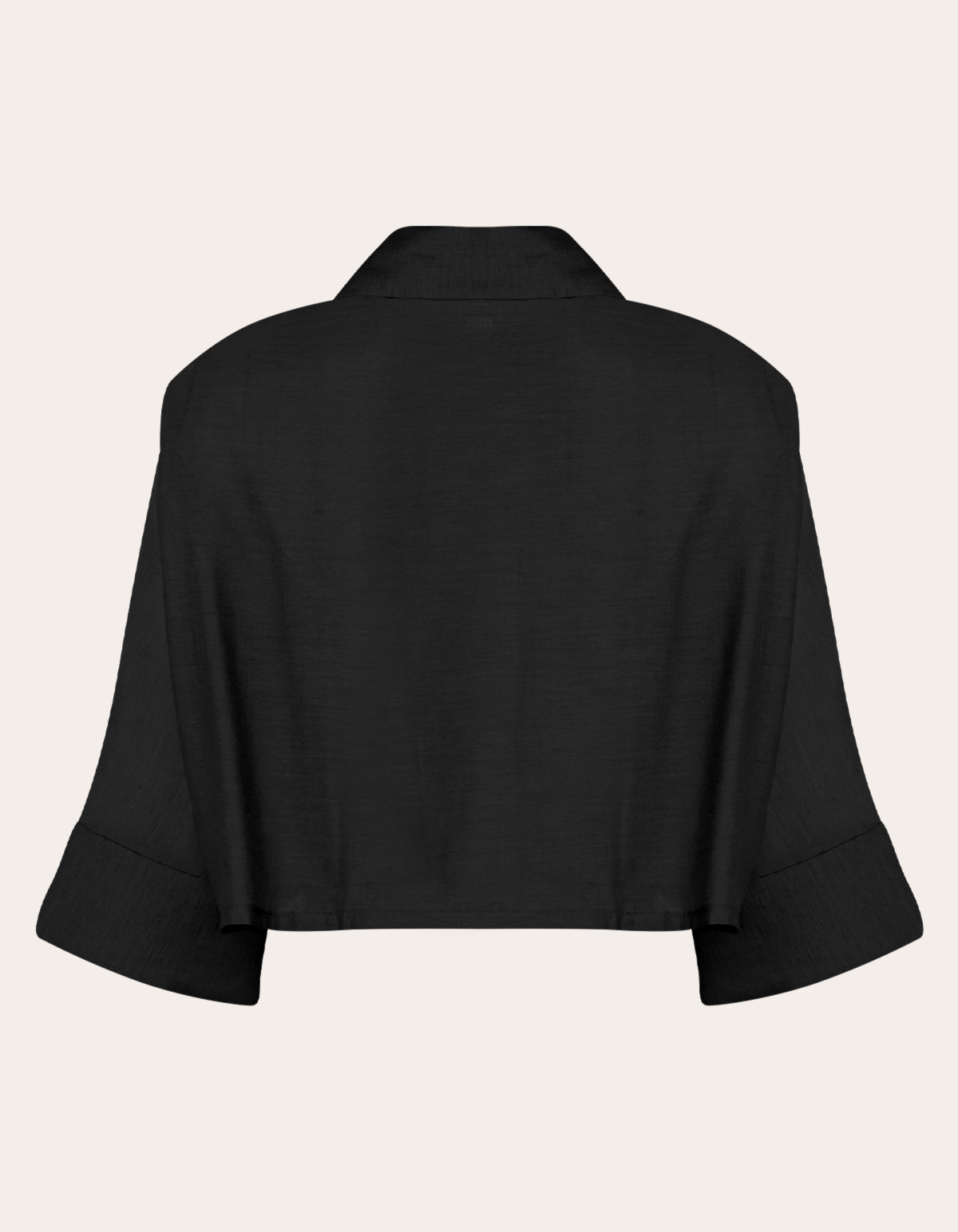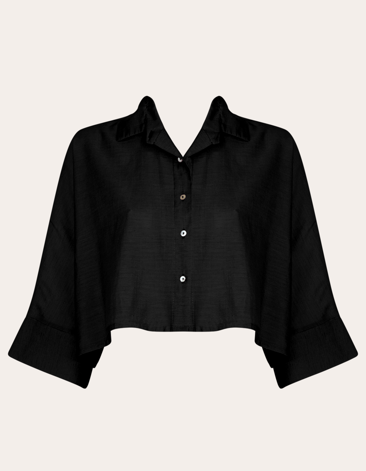 Camisa confeccionada em tecido plano de viscolinho com leve transparência. a modelagem cropped tem comprimento curto, enquanto o caimento é solto e amplo. o modelo tem mangas curtas amplas, gola com lapela e vista frontal de botões. uma peça que valoriza o corpo e traz leveza à estação com um toque de sofisticação ao visual. calça pantalona, skinny, wide leg ou shorts: escolha a sua combinação favorita e crie um look único!