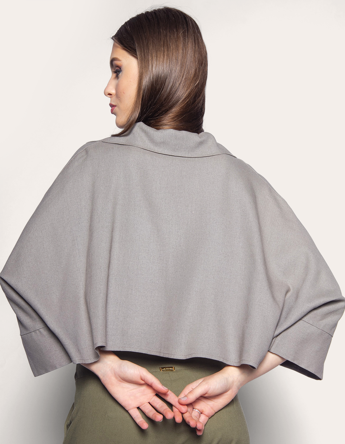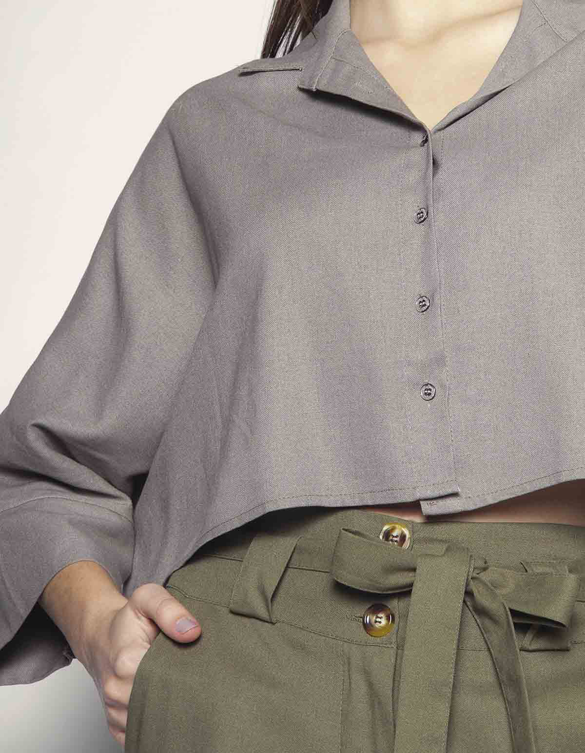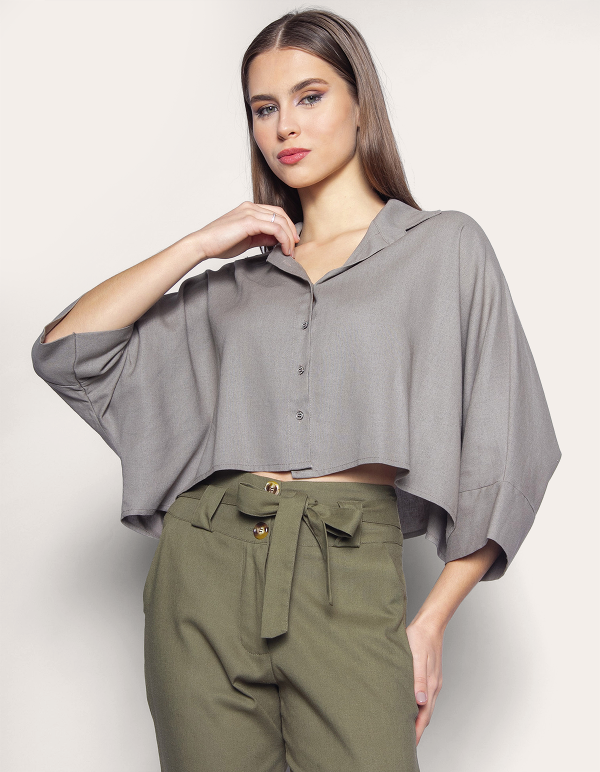 Camisa confeccionada em tecido plano de viscolinho com leve transparência. a modelagem cropped tem comprimento curto, enquanto o caimento é solto e amplo. o modelo tem mangas curtas amplas, gola com lapela e vista frontal de botões. uma peça que valoriza o corpo e traz leveza à estação com um toque de sofisticação ao visual. calça pantalona, skinny, wide leg ou shorts: escolha a sua combinação favorita e crie um look único!