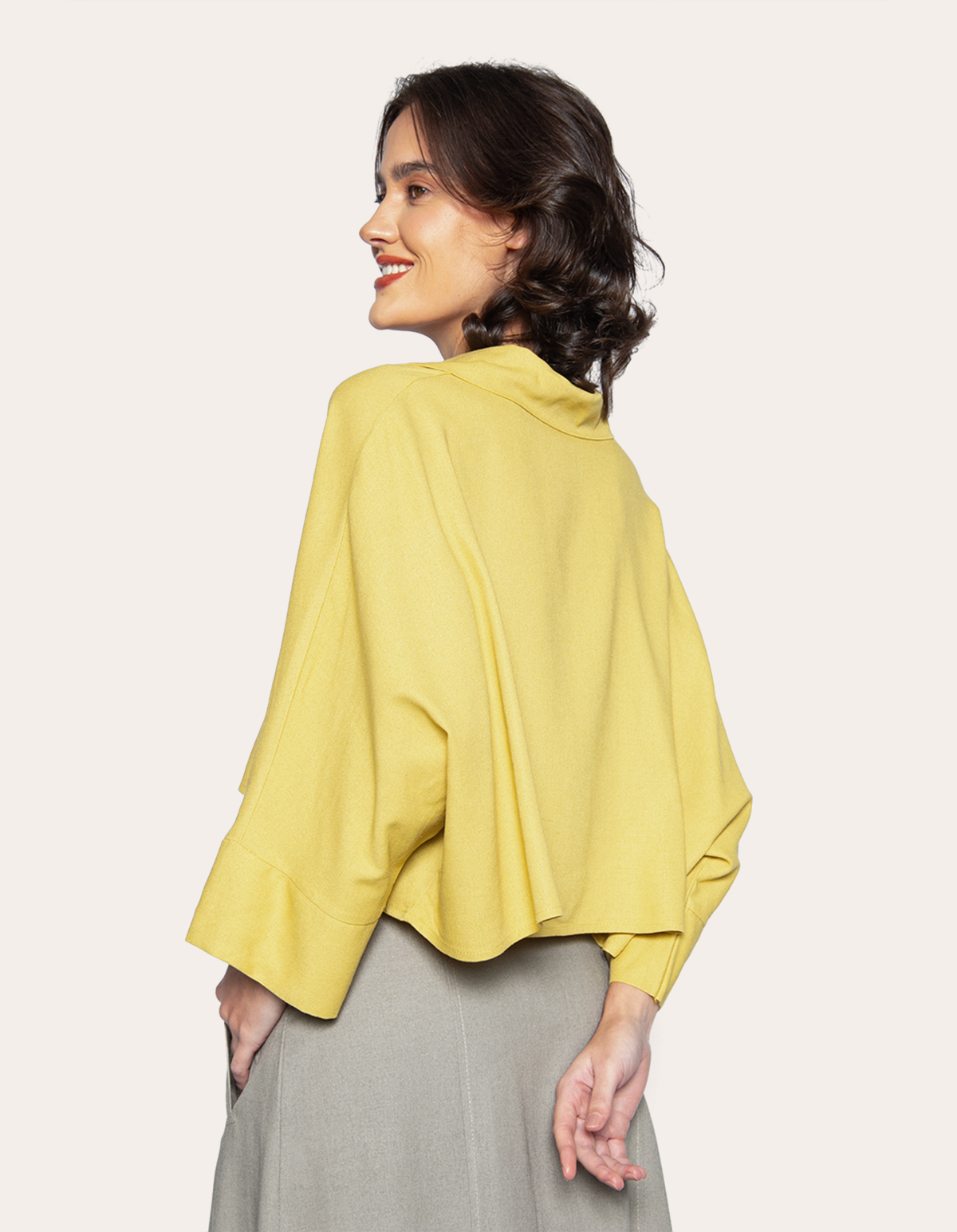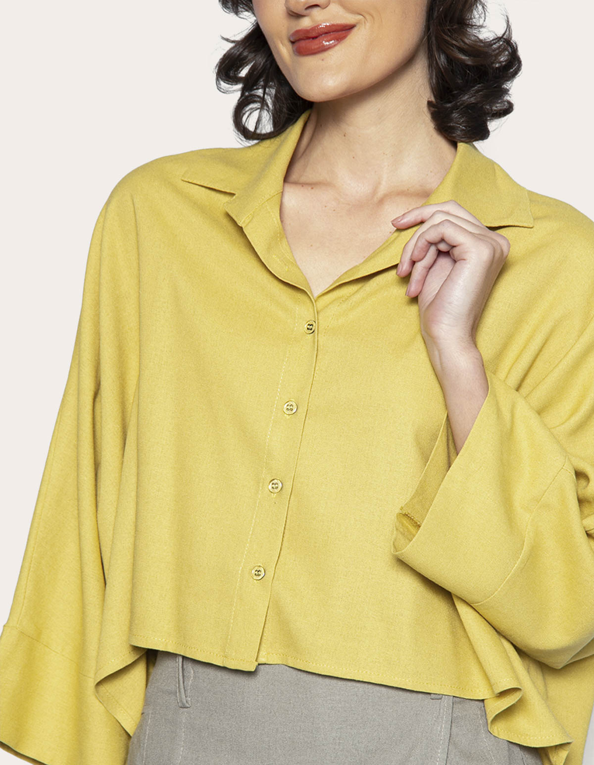 Camisa confeccionada em tecido plano de viscolinho com leve transparência. a modelagem cropped tem comprimento curto, enquanto o caimento é solto e amplo. o modelo tem mangas curtas amplas, gola com lapela e vista frontal de botões. uma peça que valoriza o corpo e traz leveza à estação com um toque de sofisticação ao visual. calça pantalona, skinny, wide leg ou shorts: escolha a sua combinação favorita e crie um look único!