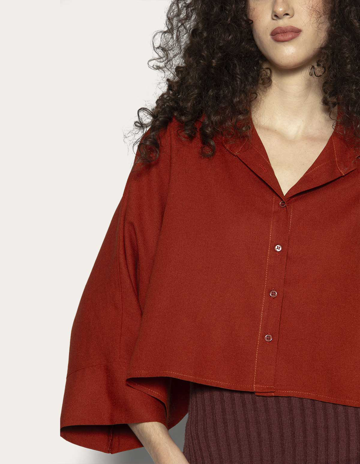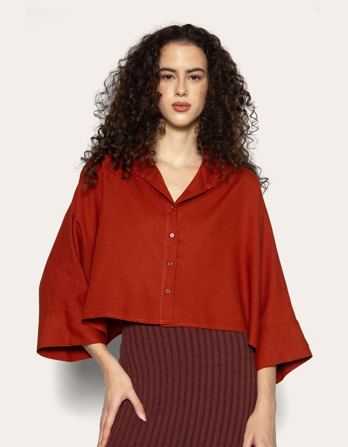 Camisa confeccionada em tecido plano de viscolinho com leve transparência. a modelagem cropped tem comprimento curto, enquanto o caimento é solto e amplo. o modelo tem mangas curtas amplas, gola com lapela e vista frontal de botões. uma peça que valoriza o corpo e traz leveza à estação com um toque de sofisticação ao visual. calça pantalona, skinny, wide leg ou shorts: escolha a sua combinação favorita e crie um look único!