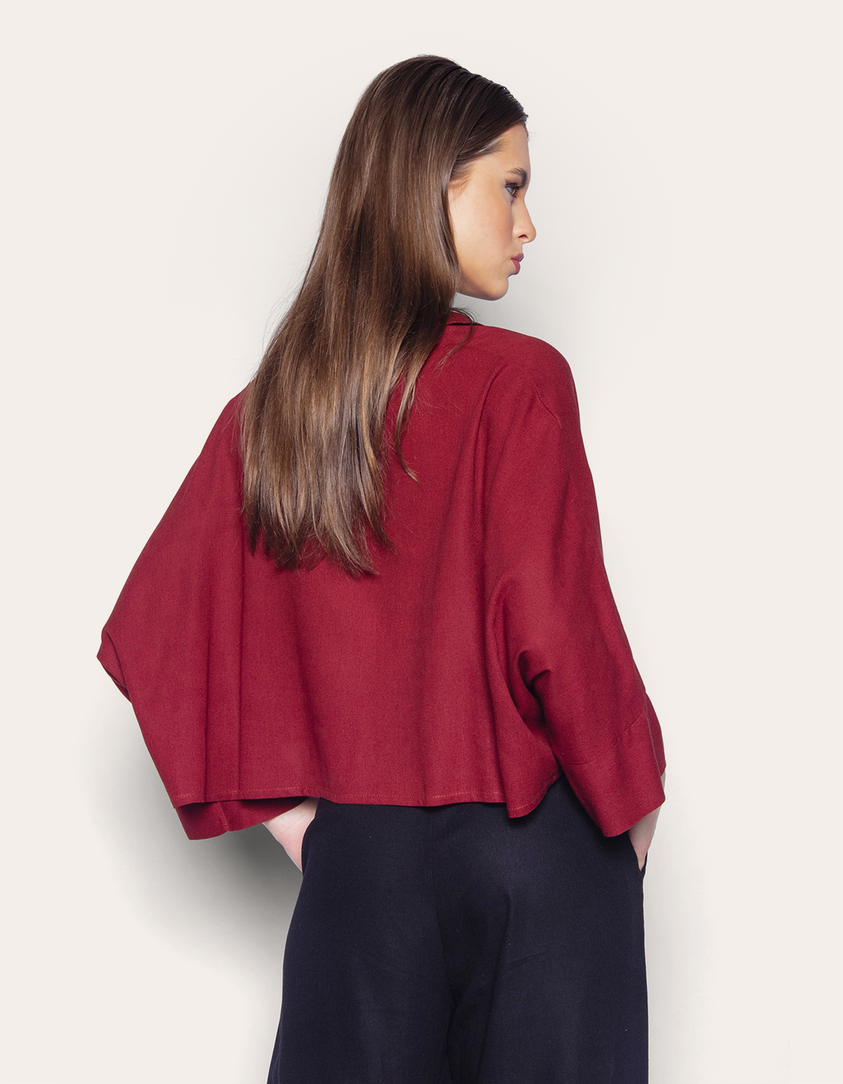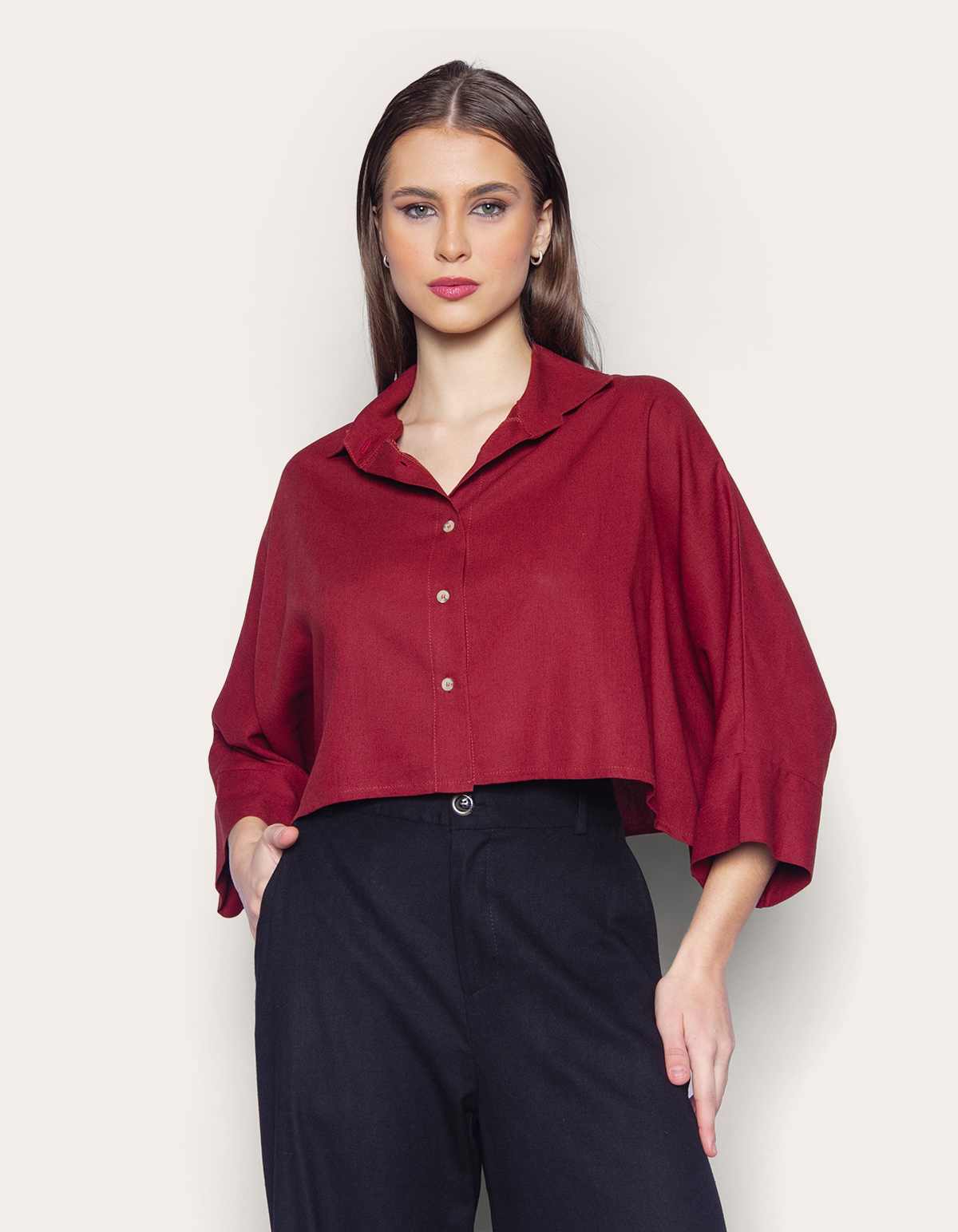 Camisa confeccionada em tecido plano de viscolinho com leve transparência. a modelagem cropped tem comprimento curto, enquanto o caimento é solto e amplo. o modelo tem mangas curtas amplas, gola com lapela e vista frontal de botões. uma peça que valoriza o corpo e traz leveza à estação com um toque de sofisticação ao visual. calça pantalona, skinny, wide leg ou shorts: escolha a sua combinação favorita e crie um look único!