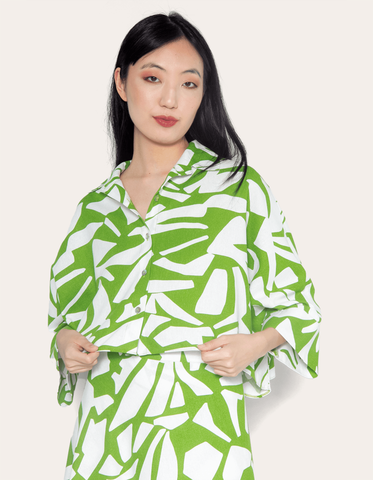 Camisa confeccionada em tecido plano de viscolinho estampado. a modelagem cropped tem comprimento curto, enquanto o caimento é solto e amplo. o modelo tem mangas curtas amplas, gola com lapela e vista frontal de botões. uma peça que valoriza o corpo e traz leveza à estação com um toque de sofisticação ao visual. calça pantalona, skinny, wide leg ou shorts: escolha a sua combinação favorita e crie um look único!
