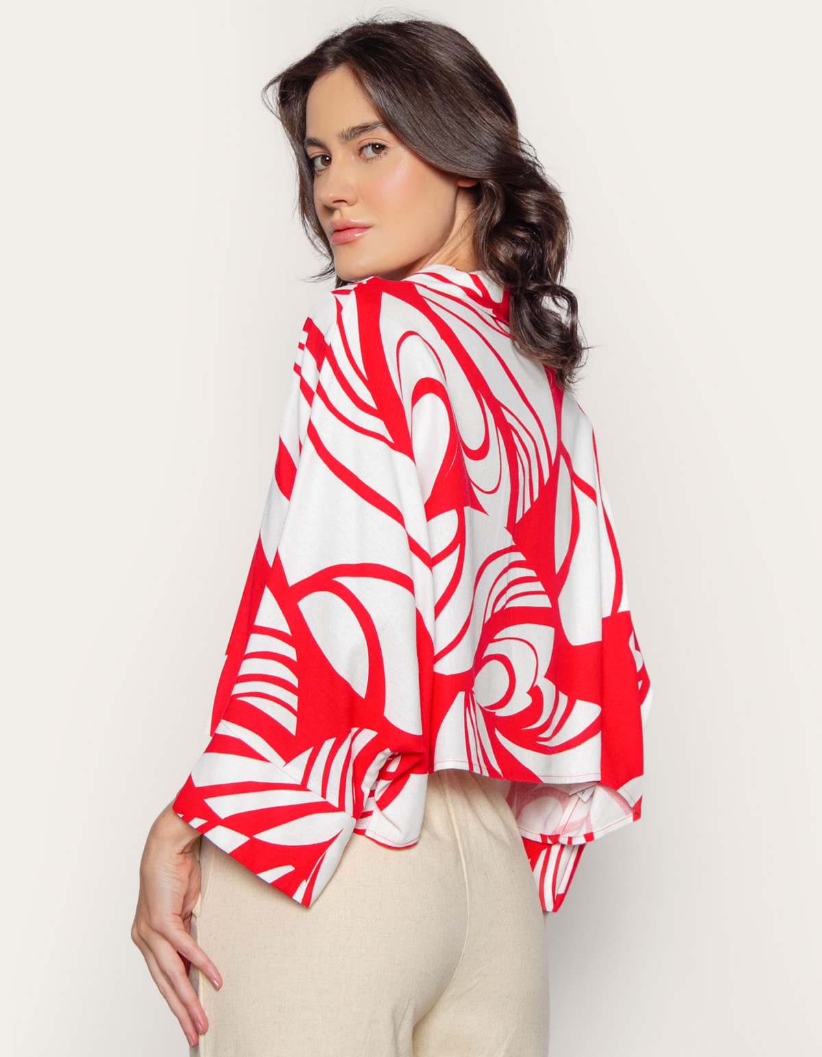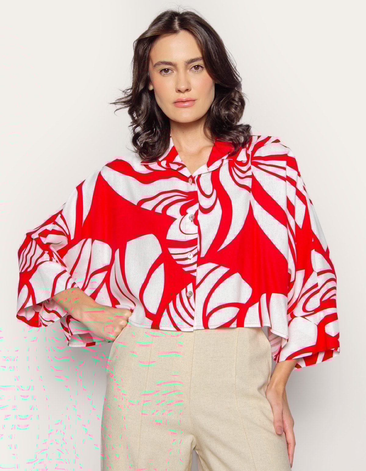 Camisa confeccionada em tecido plano de viscolinho estampado. a modelagem cropped tem comprimento curto, enquanto o caimento é solto e amplo. o modelo tem mangas curtas amplas, gola com lapela e vista frontal de botões. uma peça que valoriza o corpo e traz leveza à estação com um toque de sofisticação ao visual. calça pantalona, skinny, wide leg ou shorts: escolha a sua combinação favorita e crie um look único!