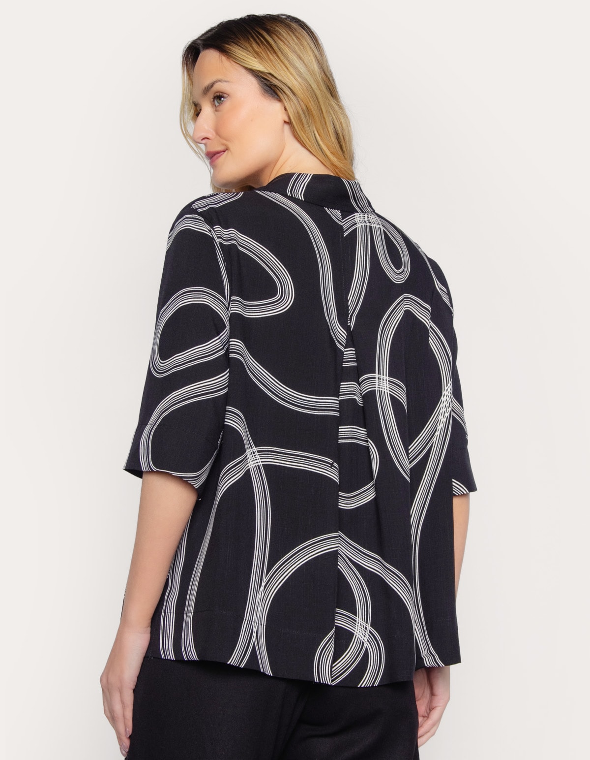 Camisa manga curta clássica, modelagem oversized reta que proporciona caimento confortável e descontraído. Comprimento na altura do quadril, mangas na altura do antebraço que caem de forma solta. Possui colarinho tradicional, fechamento por botões na frente. Tecido de aspecto leve e caimento fluído. Uma peça versátil, ideal também para sobreposições (usada aberta como terceira peça) ou fechada, combinando o conforto da modelagem solta com o toque visual da estampa contemporânea.