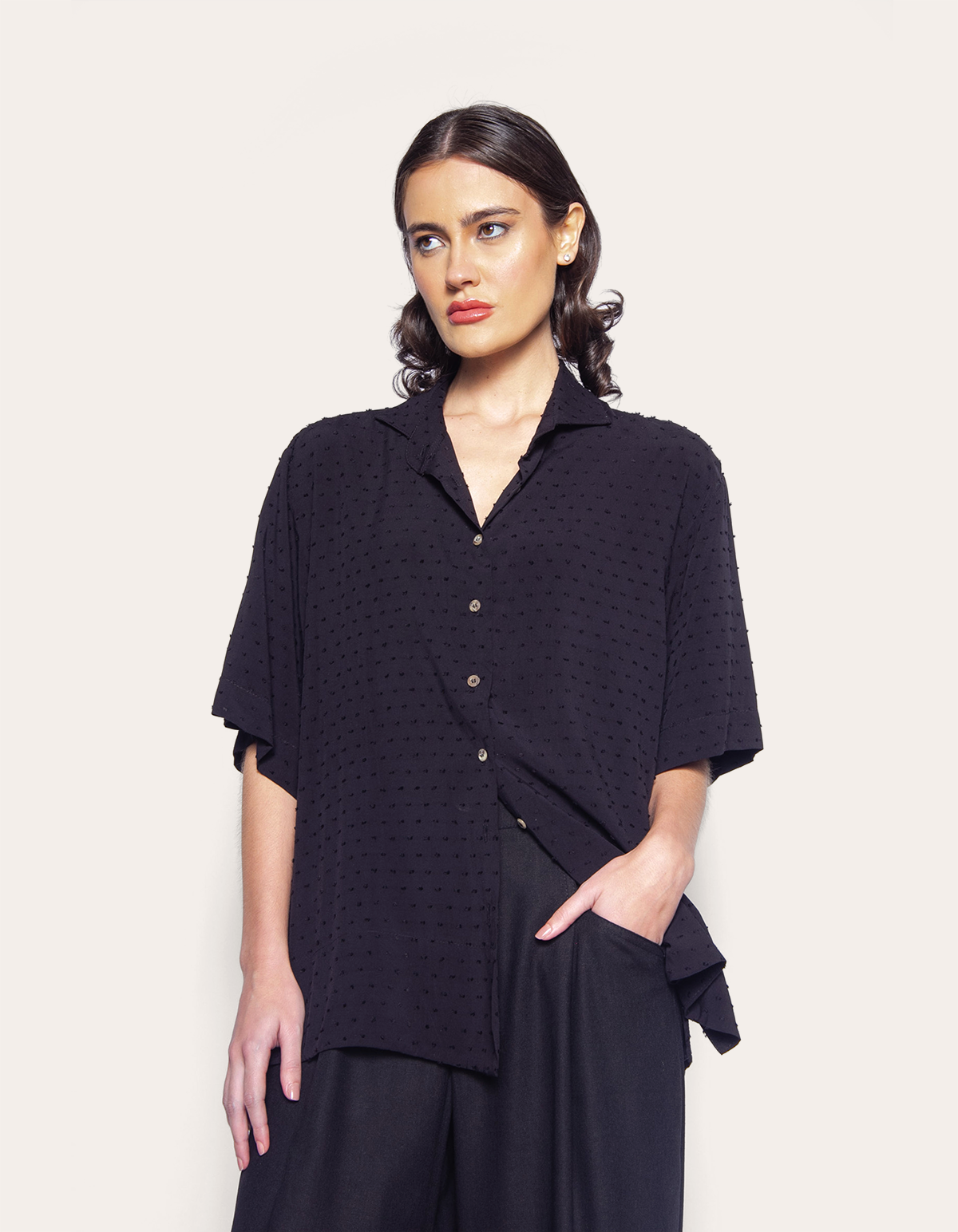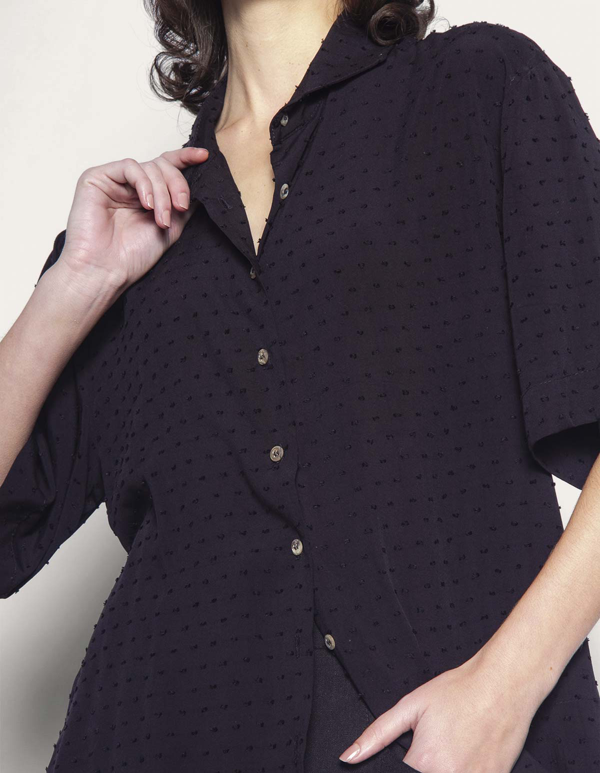 Camisa manga curta, modelagem ampla.