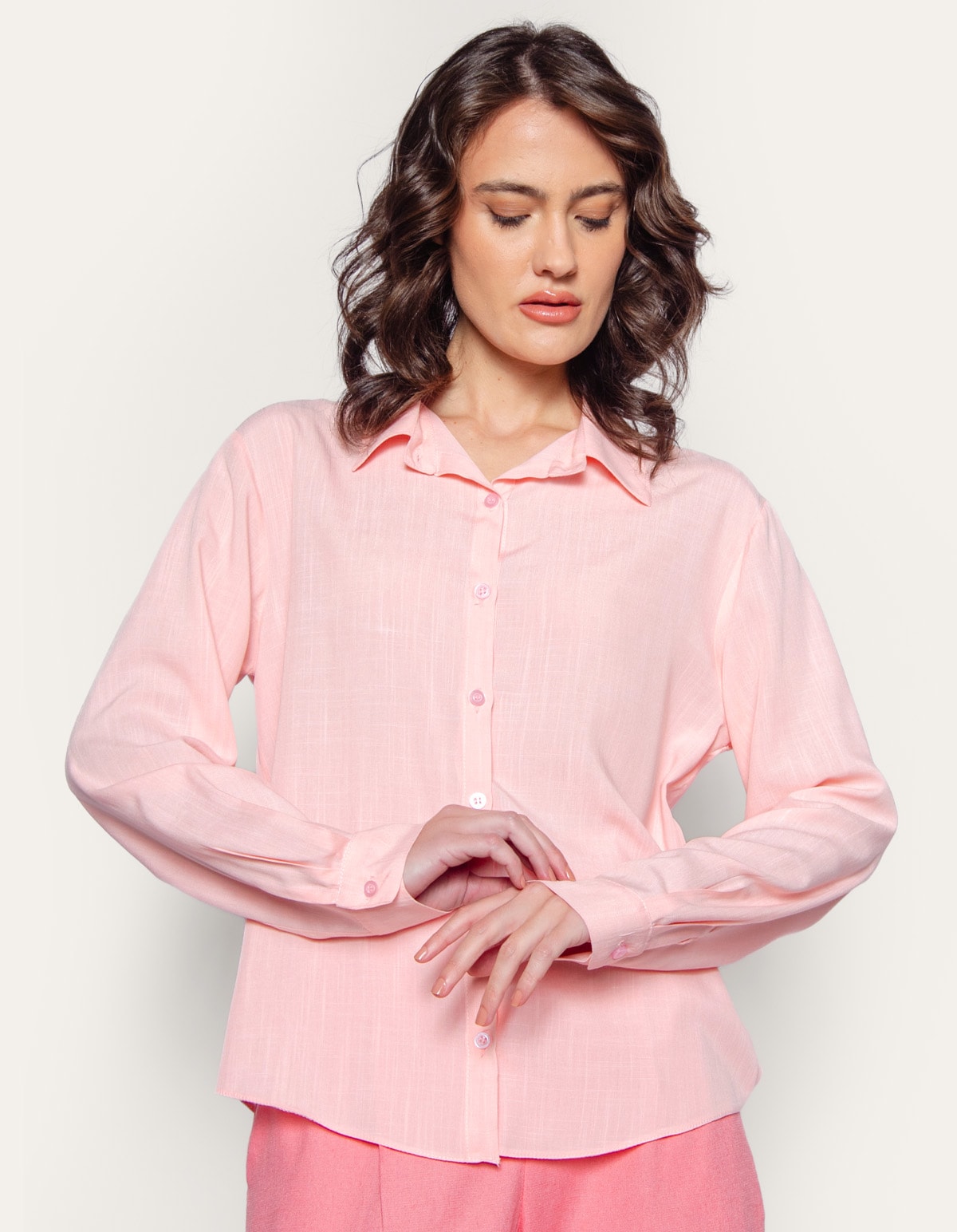 Camisa manga longa casual, possui gola clássica de colarinho, com vista frontal de fechamento feito por botões. Modelo de acabamento simples e funcional, característico de camisas básicas e versáteis, de estilo clássico, perfeita para compor looks de escritório mais leves ou combinações casuais e elegantes.