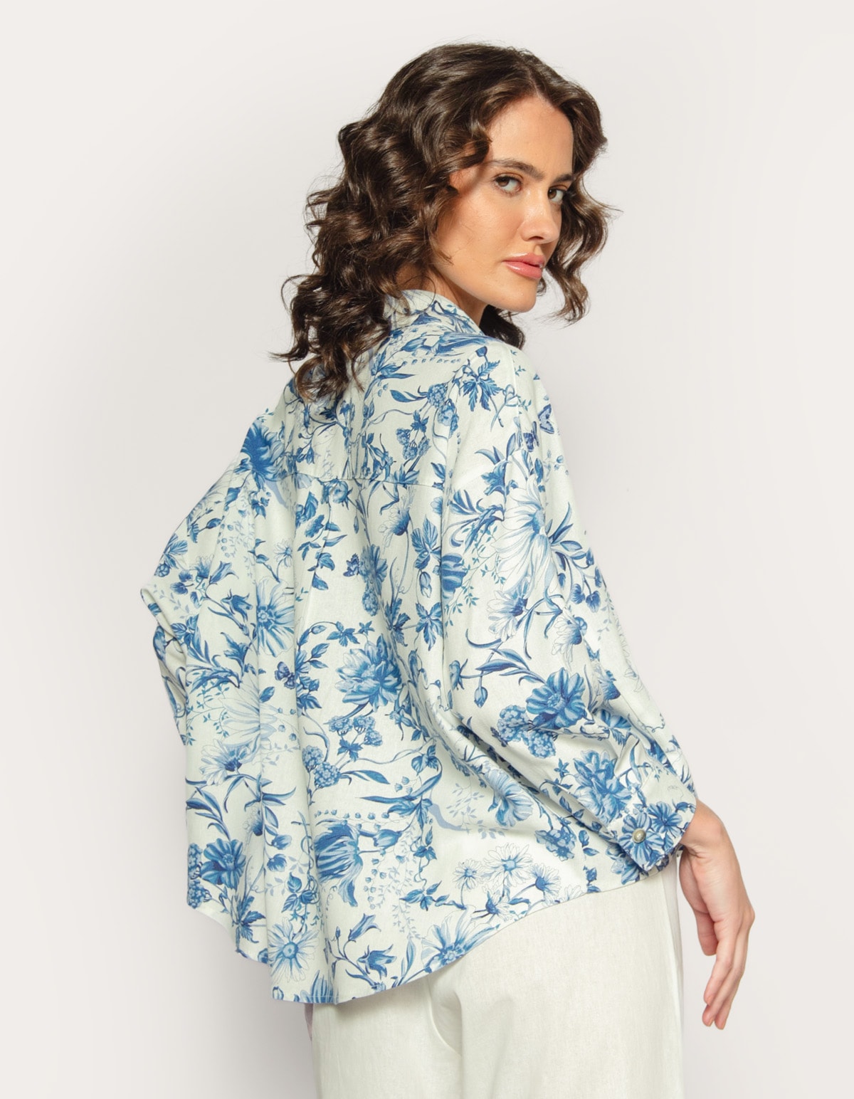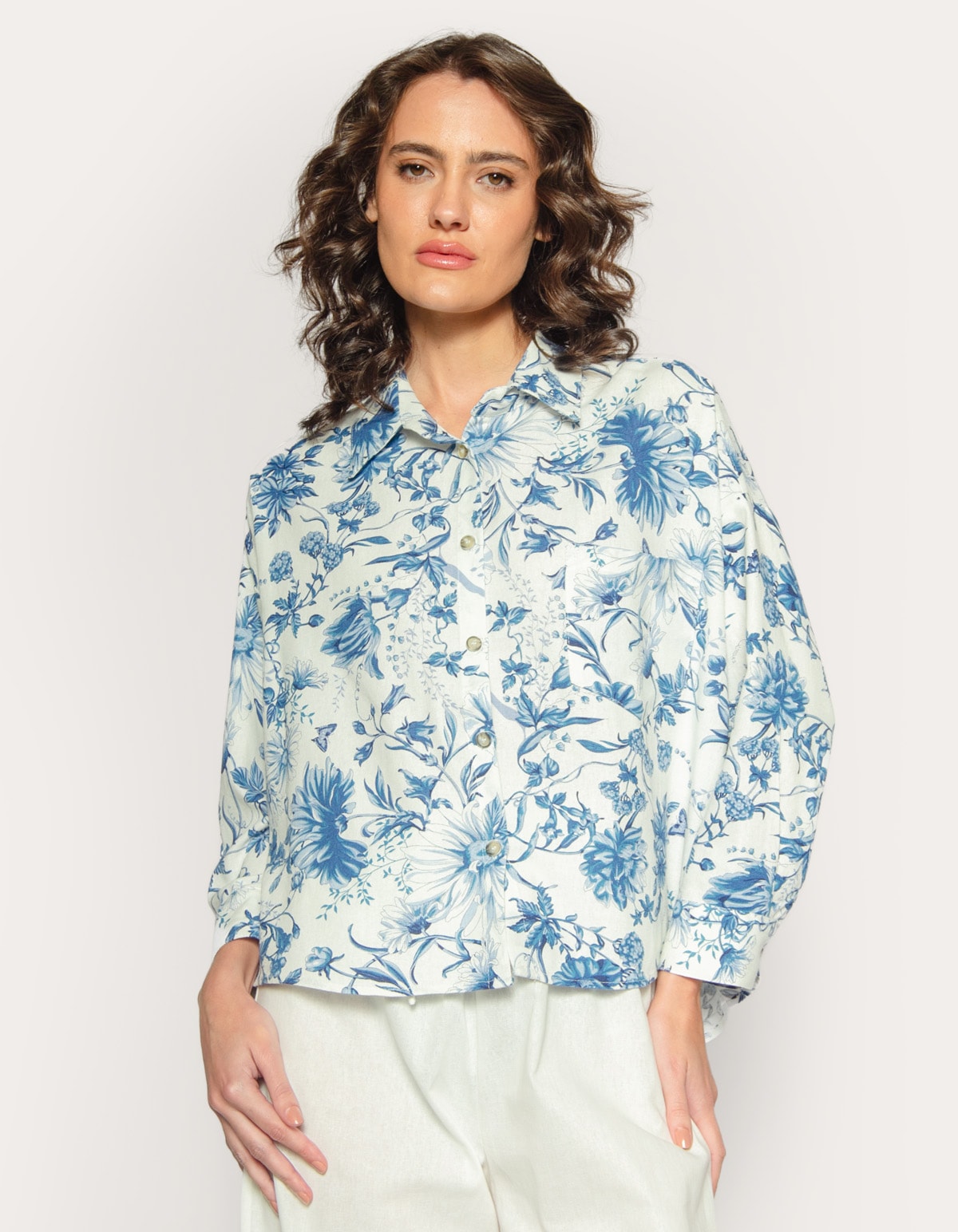 Camisa estampada manga longa gola tradicional, fechamento frontal com botões, caimento oversized e mais curto (cropped). Modelo elegante com estampa vibrante, ideal para um visual chic ou de verão.