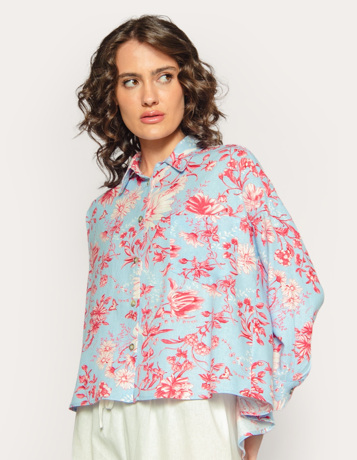 Camisa manga longa ampla linho blend estampada Azul claro/rosa escuro
