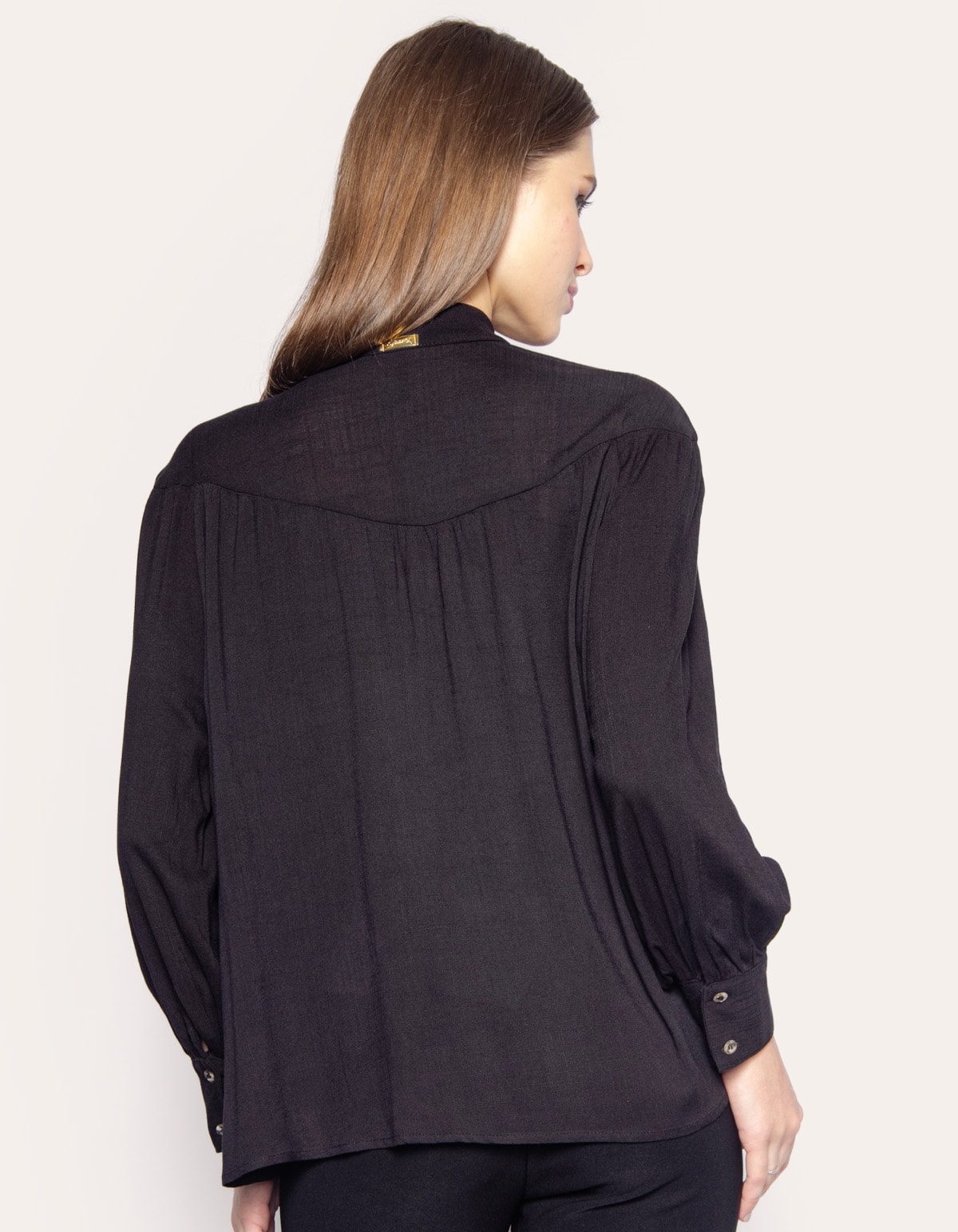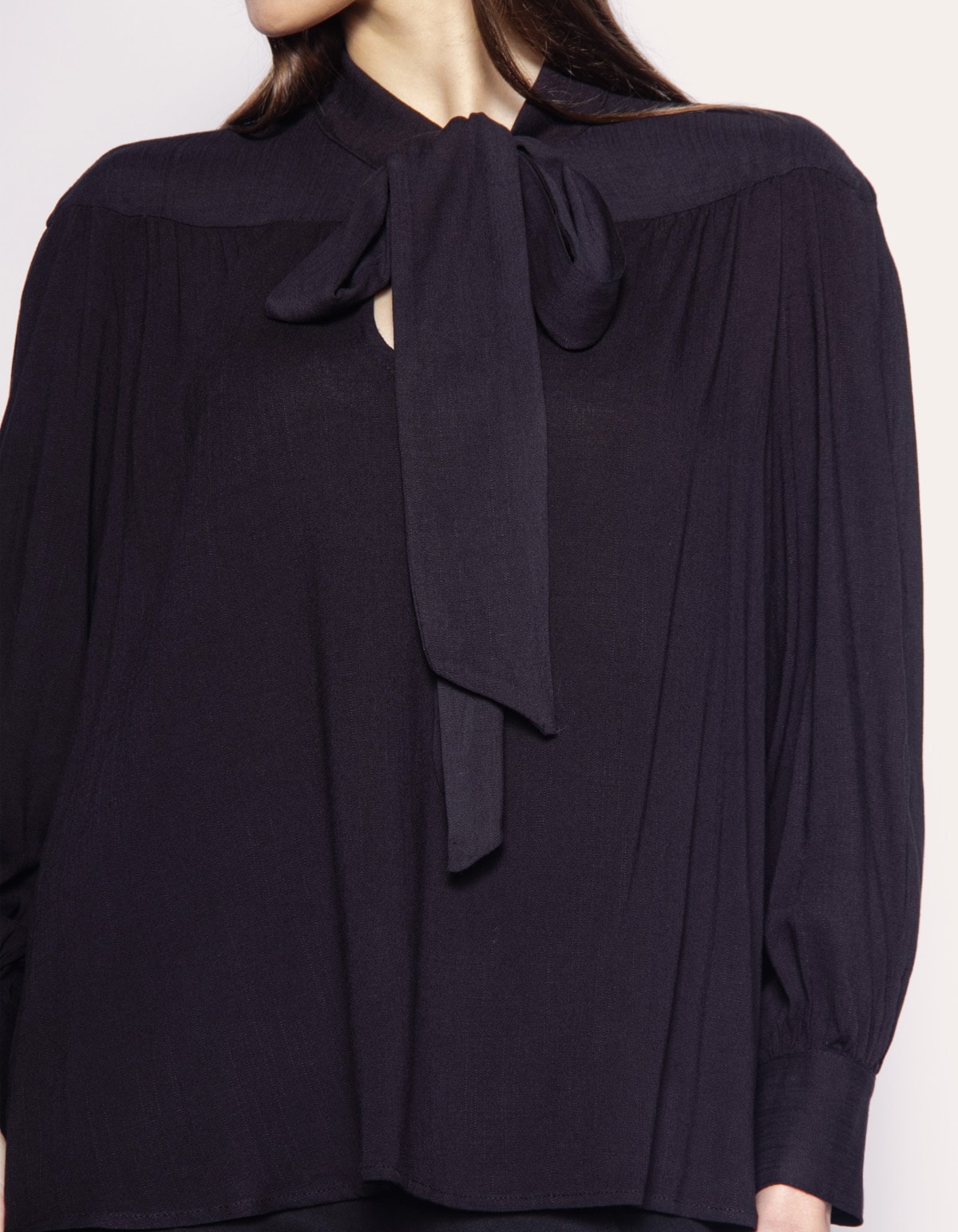 Camisa manga longa com punho. A peça tem a modelagem e caimento confortavelmente solta ao corpo. O modelo tem na gola tiras largas para fazer laço. Crie looks clássicos e modernos com essa peça rica em detalhe.
