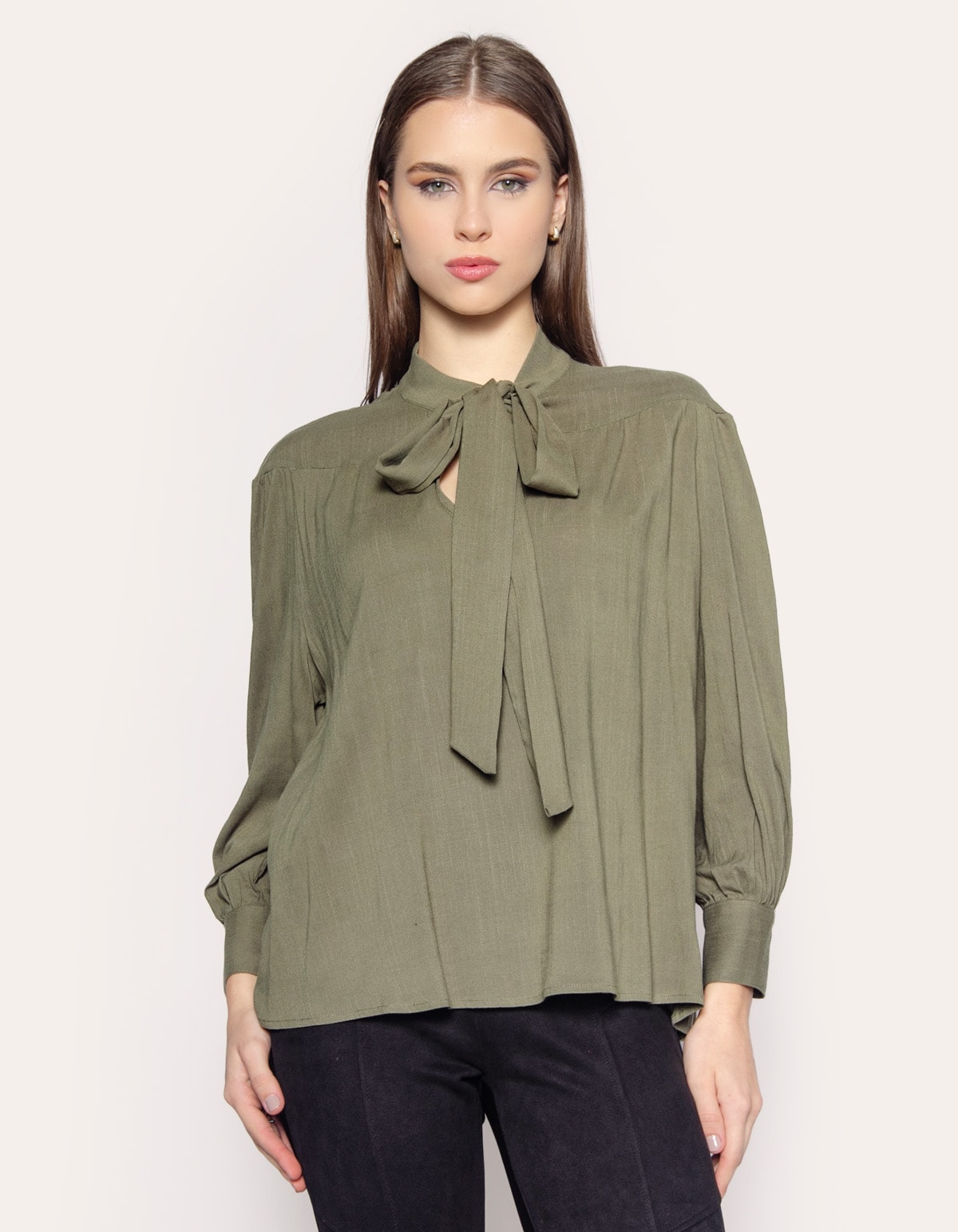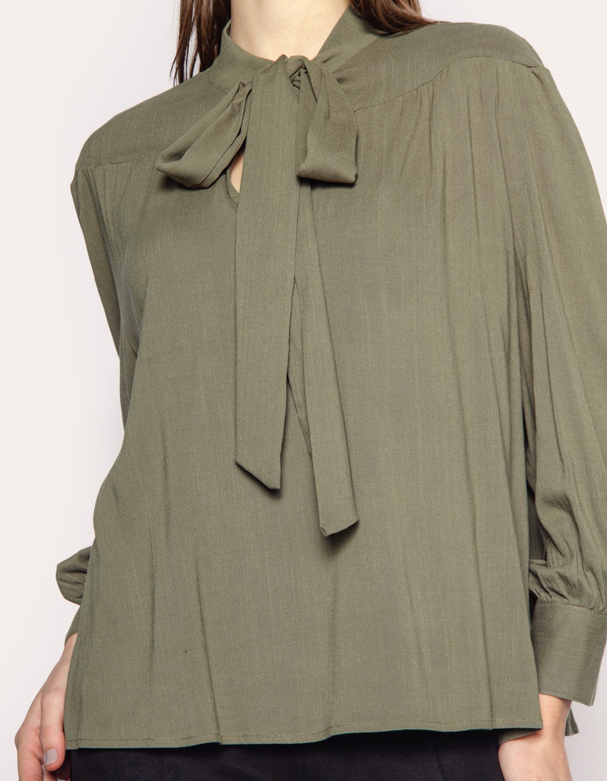 Camisa manga longa com punho. A peça tem a modelagem e caimento confortavelmente solta ao corpo. O modelo tem na gola tiras largas para fazer laço. Crie looks clássicos e modernos com essa peça rica em detalhe.