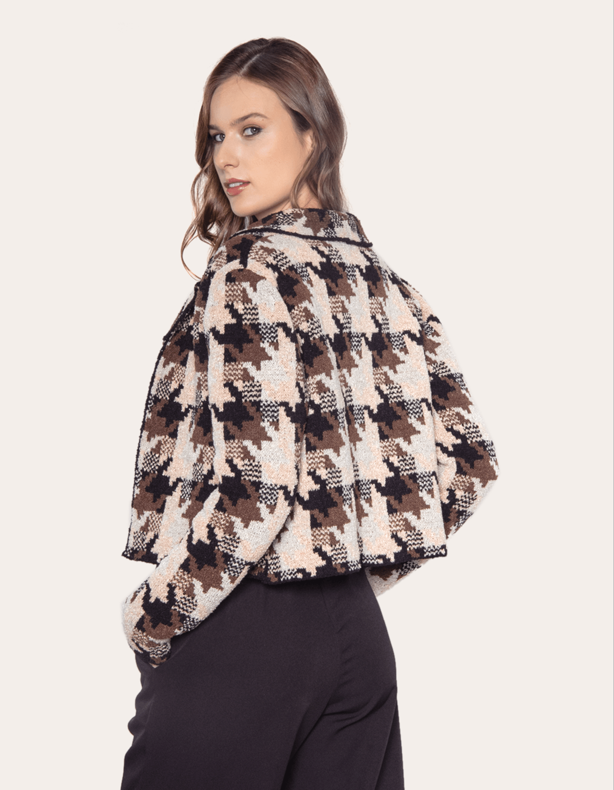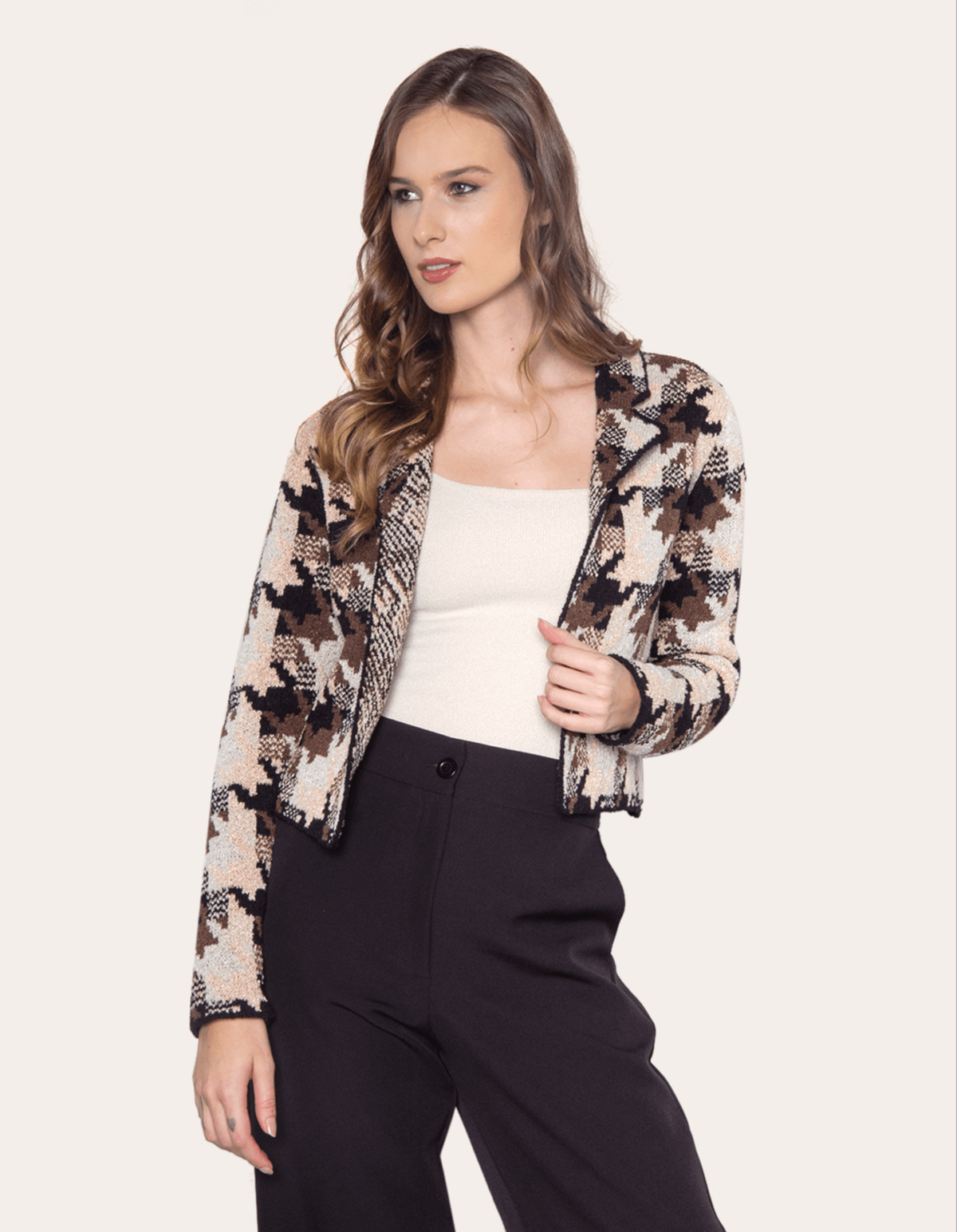 Casaqueto aberto tricot padronagem pied poule. conforto e estilo clássico reinventado, é perfeito para aqueles que buscam combinar tradição com um toque contemporâneo.