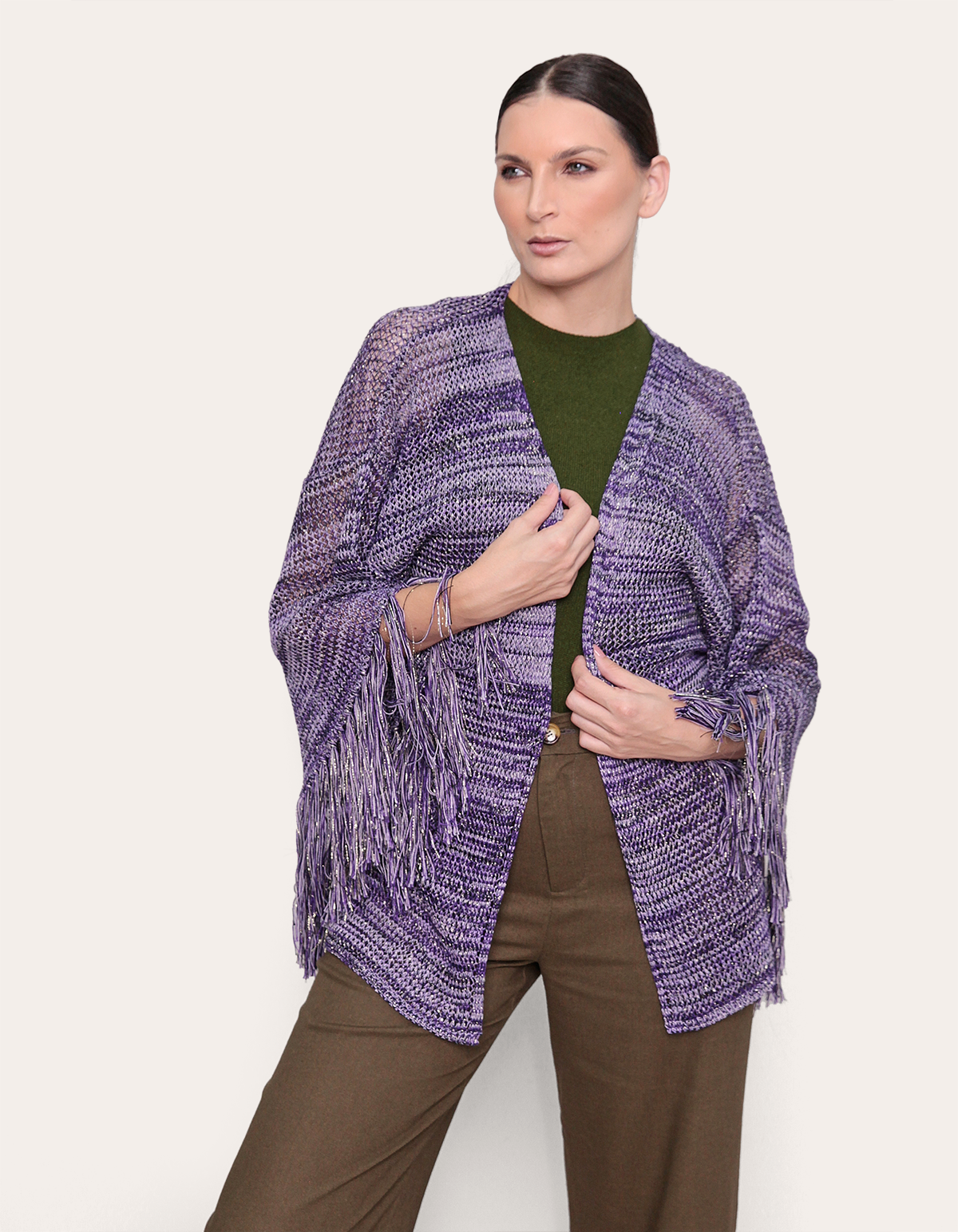 Casaco aberto de tricot mesclado com franja nas mangas. ele tem uma beleza atemporal que nunca sai de moda.