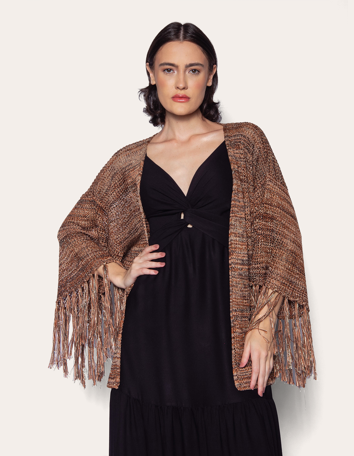 Casaco aberto de tricot mesclado com franja nas mangas. ele tem uma beleza atemporal que nunca sai de moda.