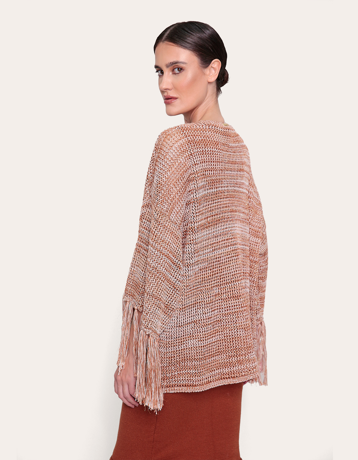 Casaco aberto de tricot mesclado com franja nas mangas. ele tem uma beleza atemporal que nunca sai de moda.