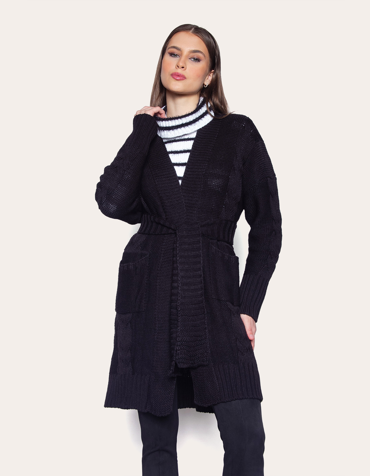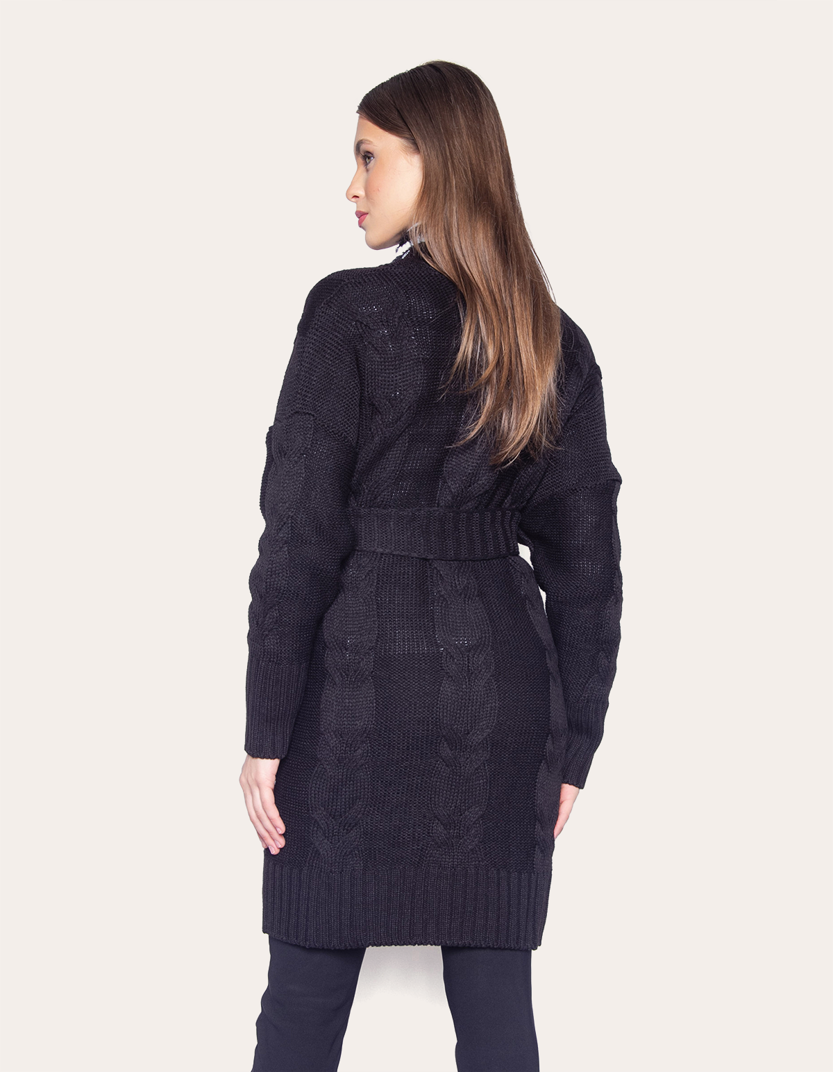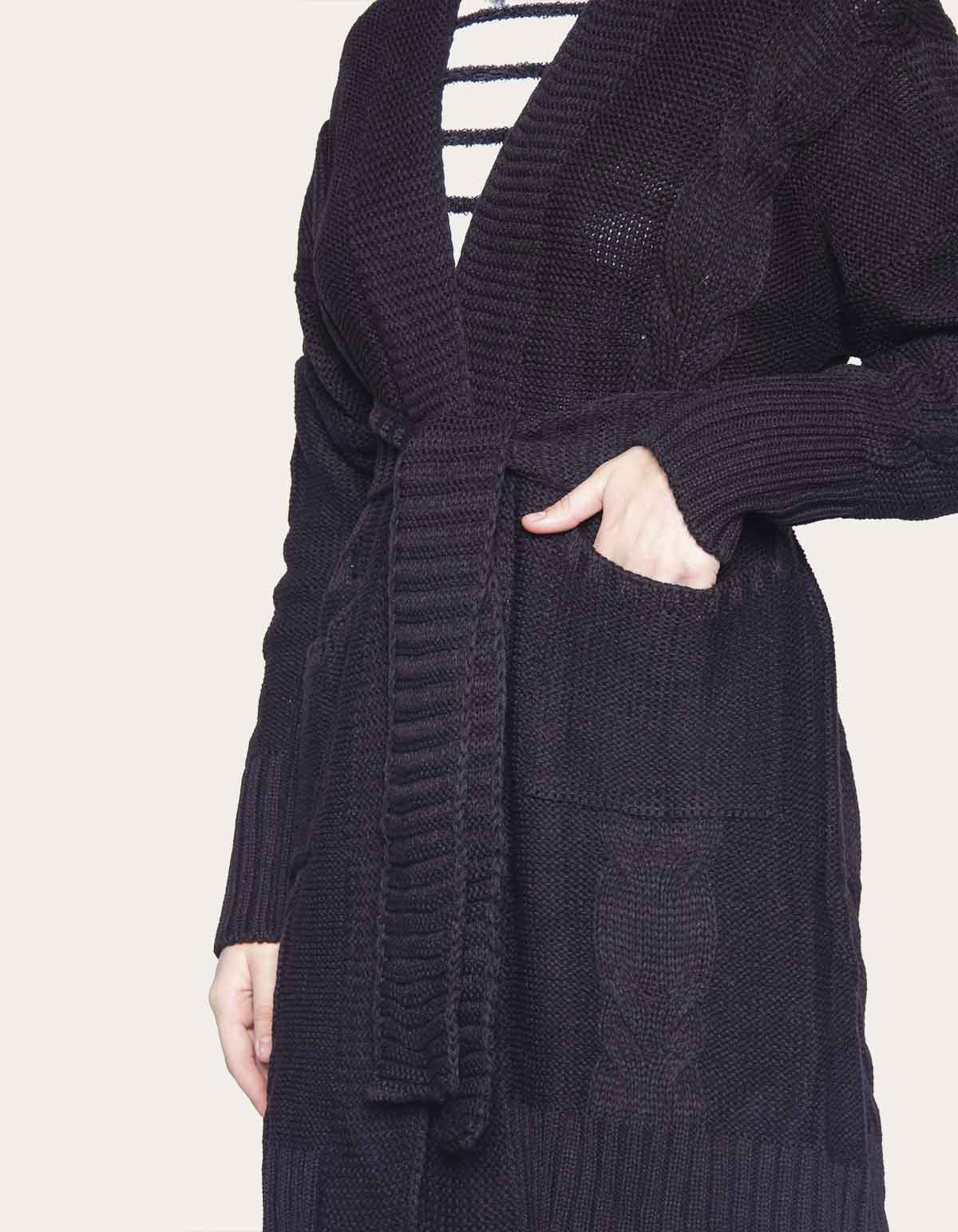 Casaco longo produzido em tricot com padronagem em trança. Modelo com bolsos e faixa. O modelo longo deste casaco oferece um visual elegante e uma cobertura extra, ideal para dias mais frios. A modelagem alongada proporciona sofisticação ao look, garantindo proteção contra o clima sem abrir mão do estilo. Além disso, o casaco longo tem um efeito visual que alonga a silhueta, adicionando um toque de glamour ao visual.