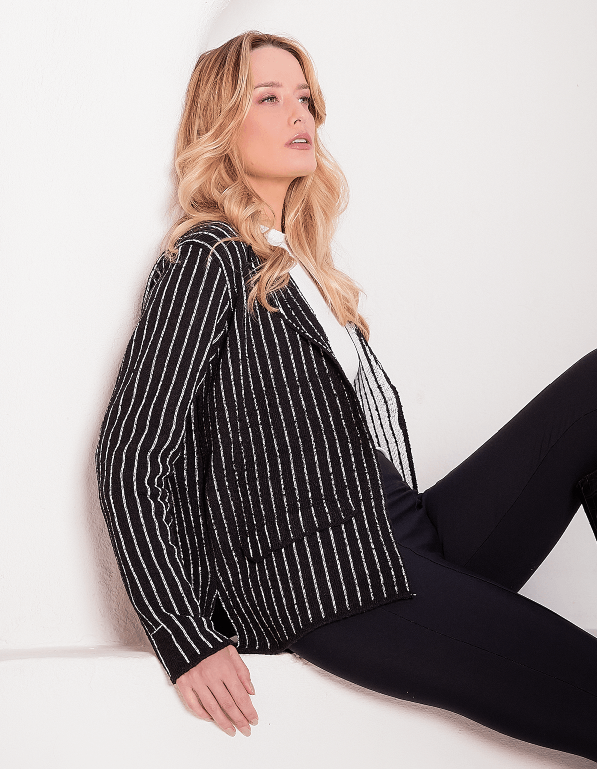 Casaco aberto confeccionado em tricot padronagem listrada, camimento reto, possui lapelas na frente não funcionais. indispensável no closet feminino é uma peça atemporal, perfeita para compor diversos looks com elegância. invista nele combinando com acessórios metálicos, blusa preta, calça jeans escura e bota, para um visual easychic.