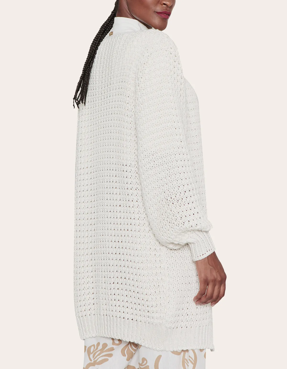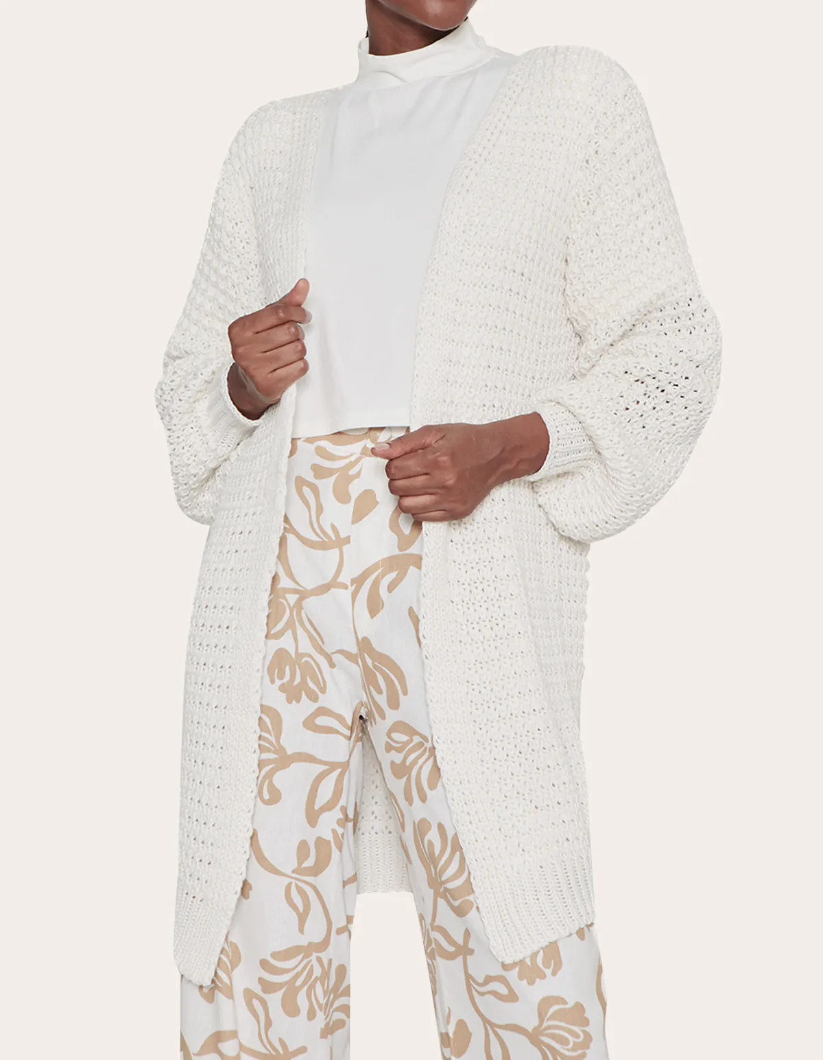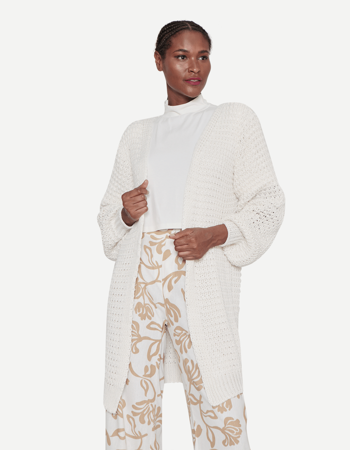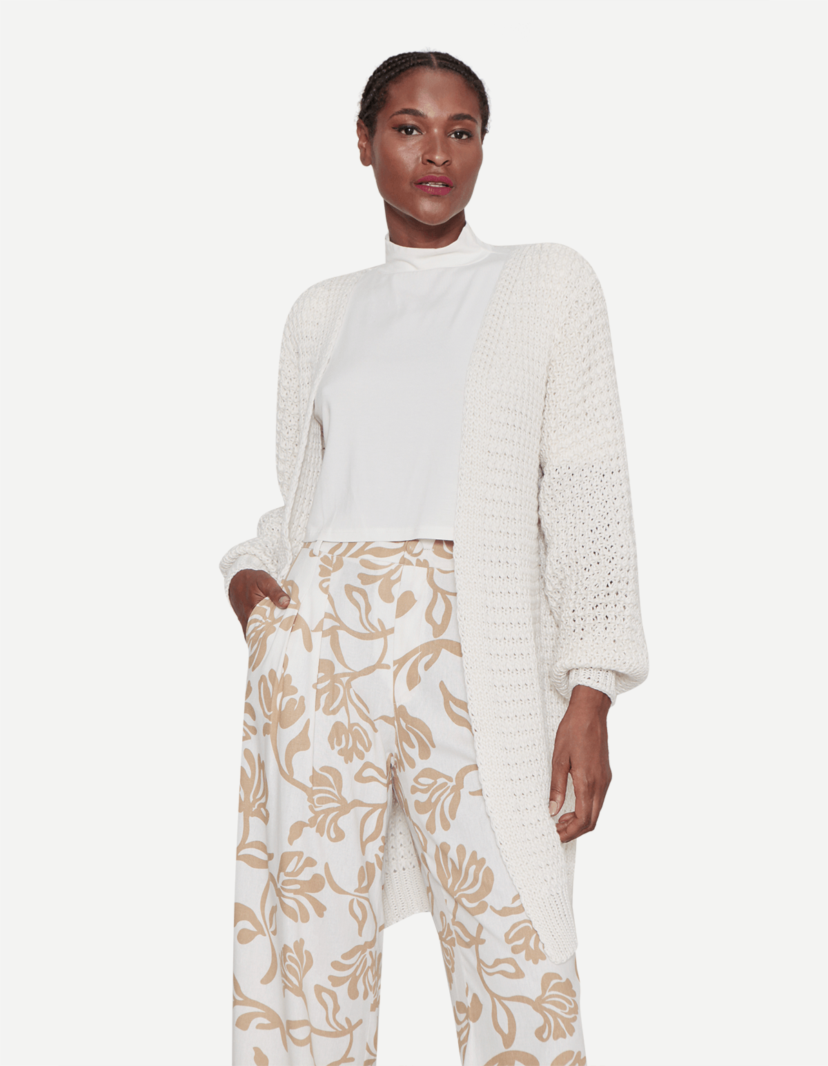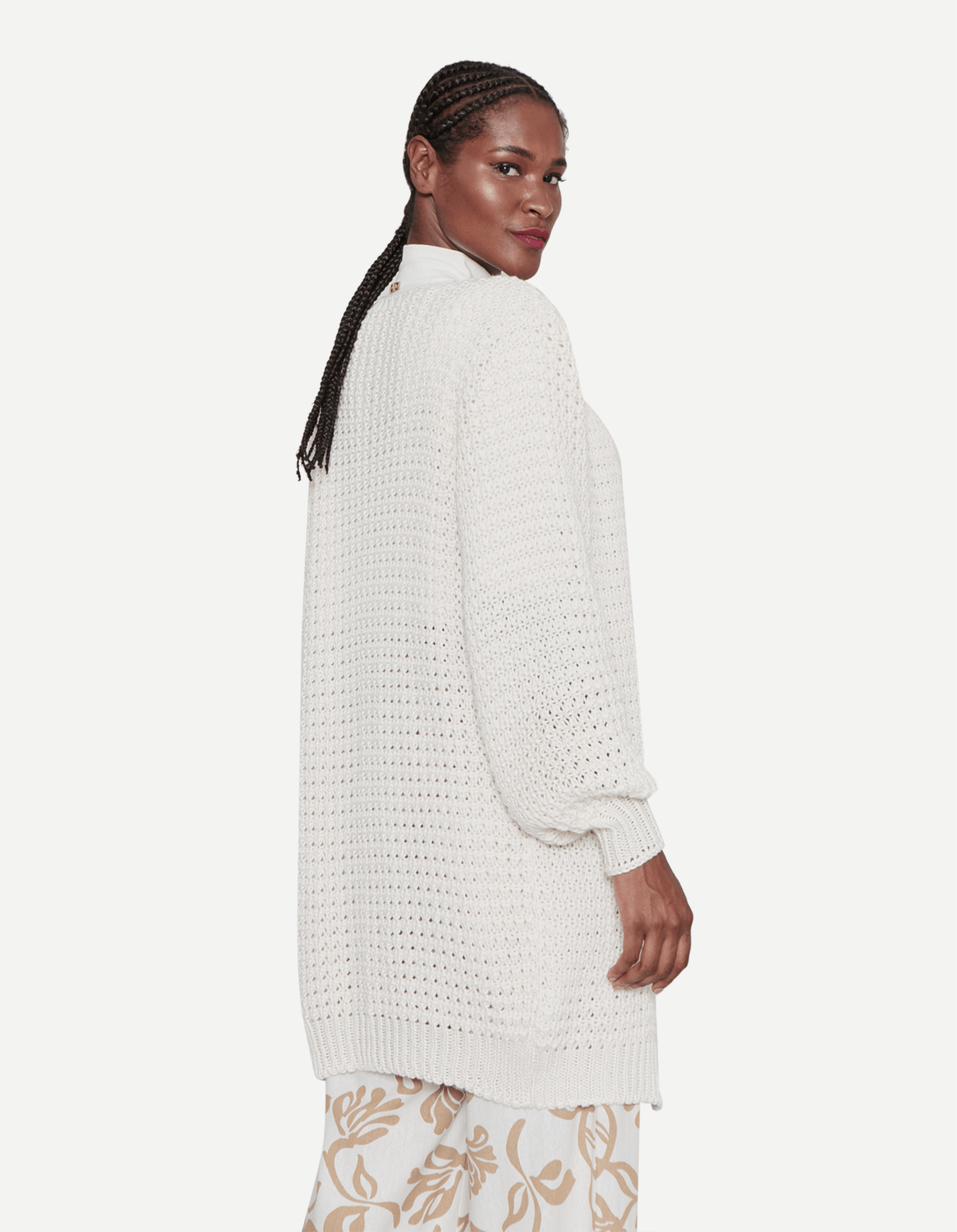 Apresentamos o casaco de tricot ponto aberto, uma peça versátil que combina conforto e estilo. confeccionado com ponto aberto, oferece uma textura elegante. sua modelagem é ampla e reta, de comprimento longo, proporcionando um caimento fluído. mangas longas com punhos ajustados em acabamento canelado e detalhe de barra adicionam toques de elegância. o casaco não possui fechamento, permitindo usá-lo de maneira versátil e descontraída. ideal para looks confortáveis, adaptando-se a diferentes ocasiões. o tricot ponto aberto e a modelagem ampla criam um visual texturizado e fluído. perfeito para um passeio casual ou encontro com amigos, é a escolha ideal para quem valoriza conforto e estilo.