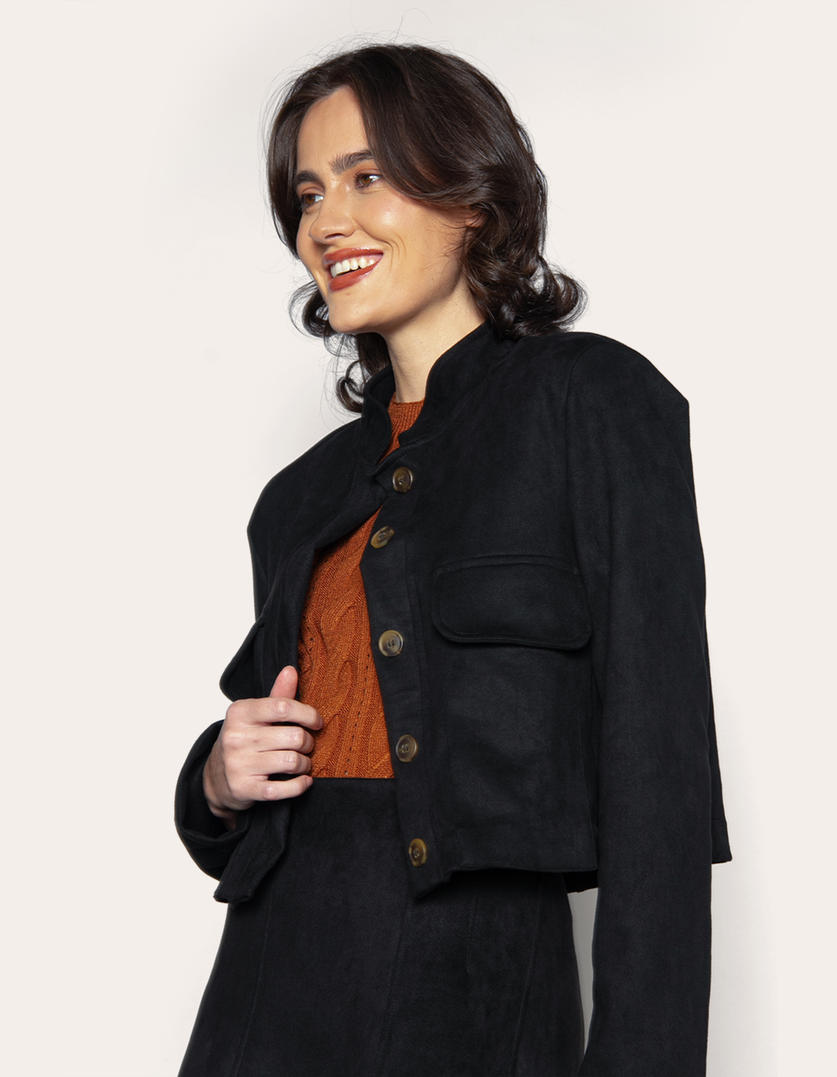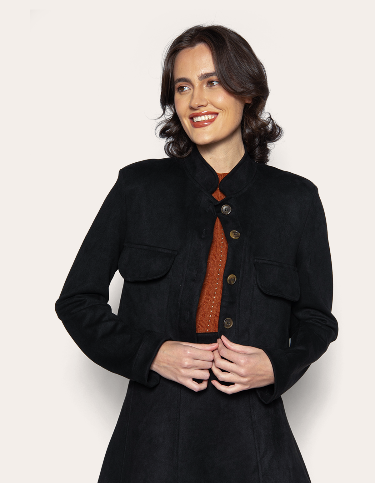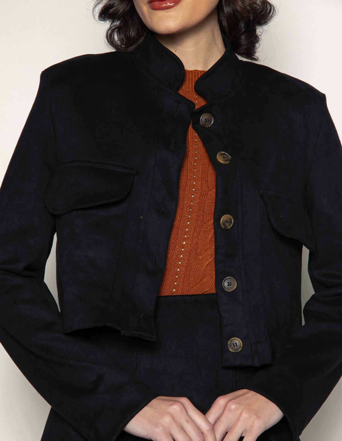 Casaqueto em suede, golinha alta, fechamento por botões, possui bolsos com lapelas na frente e ombreiras. O tecido de malha suede proporciona uma experiência de uso luxuosa, com um toque aveludado que eleva o nível de qualquer vestimenta. Este casaco é ideal para mulheres que procuram combinar elegância funcional com conforto excepcional, perfeito para o uso diário ou ocasiões especiais.