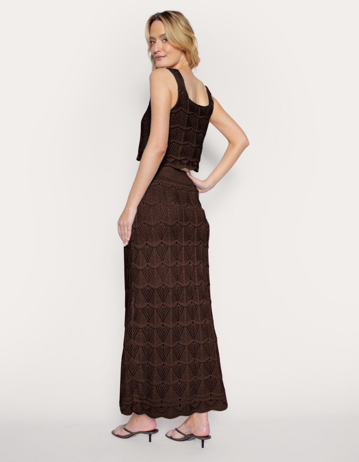 Elegante conjunto de duas peças top e saia longa feito em um trabalho de tricot. O top tem alças médias/largas e decote redondo discreto, de comprimento cropped. Apresenta um padrão de camadas em formato de conchas ou escamas. A saia é longa, ajustada ao corpo, com caimento levemente evasê, possui uma cintura lisa e discreta. A repetição do padrão de conchas cria um efeito visual de ondas que dão movimento e sofisticação à peça. Combinando a tendência do trabalho artesanal e da modelagem boho chic com uma silhueta alongada e elegante, sendo perfeito para um look de festa ou evento especial.