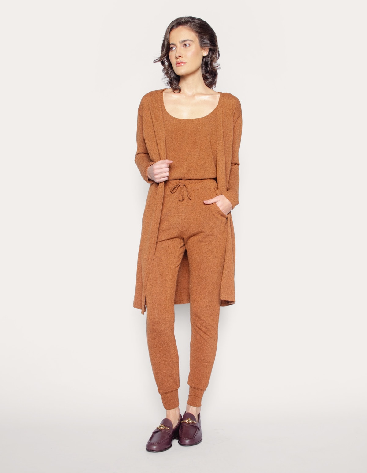 Apresentamos um conjunto de 3 peças composto por regata, calça jogger e cardigã/kimono. a regata oferece elegância feminina, a calça jogger é versátil para várias ocasiões e o cardigã/kimono alongado completa o look enquanto protege do frio. um conjunto que combina estilo, conforto e praticidade para todas as estações.