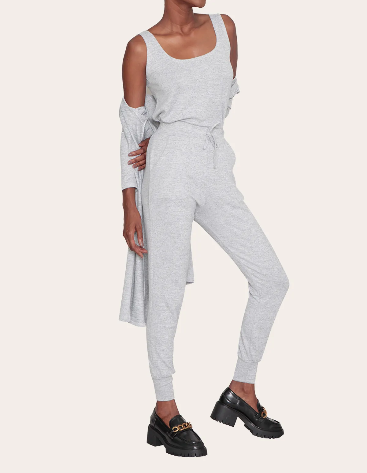 Apresentamos um conjunto de 3 peças composto por regata, calça jogger e cardigã/kimono. a regata oferece elegância feminina, a calça jogger é versátil para várias ocasiões e o cardigã/kimono alongado completa o look enquanto protege do frio. um conjunto que combina estilo, conforto e praticidade para todas as estações.