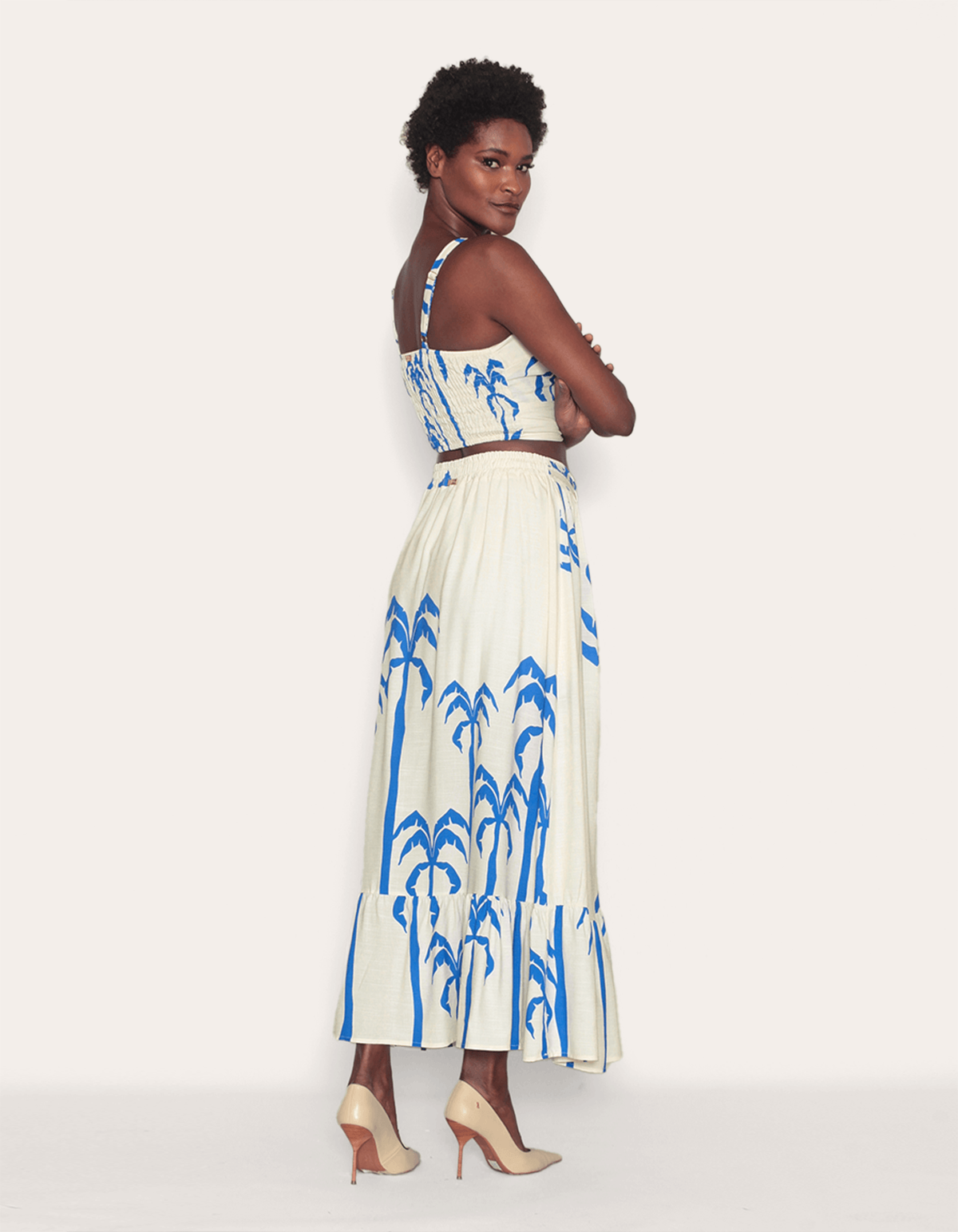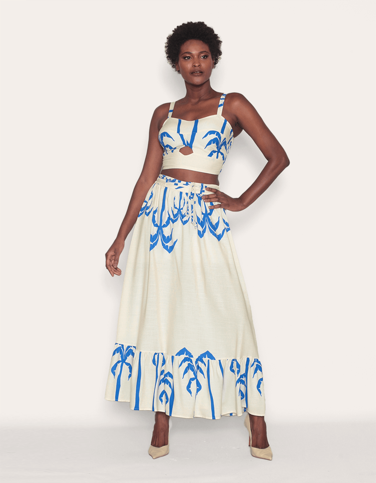 Conjunto de top cropped de alça média com bojo, detalhe de recorte abaixo do busto e lastex nas costas para melhor ajuste e saia longa com faixa embutida para amarração e elástico atrás na cintura, possui forro. com estampas lindas e conforto excepcional, ele é perfeito para quem busca estilo e versatilidade, use-o como um conjunto completo para uma aparência coordenada e sofisticada, ou misture e combine as peças com outras do seu guarda-roupa para criar looks exclusivos e cheios de estilo.