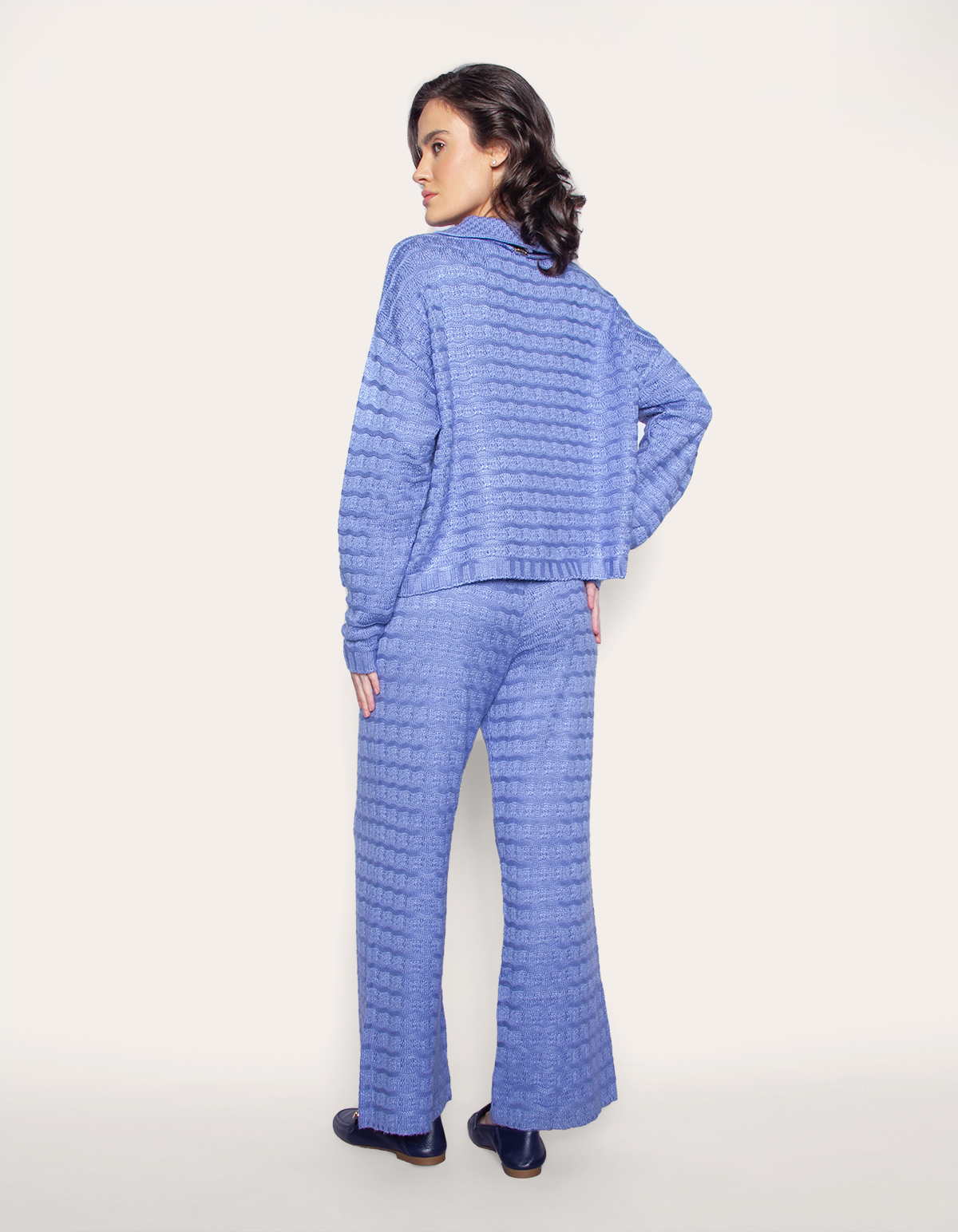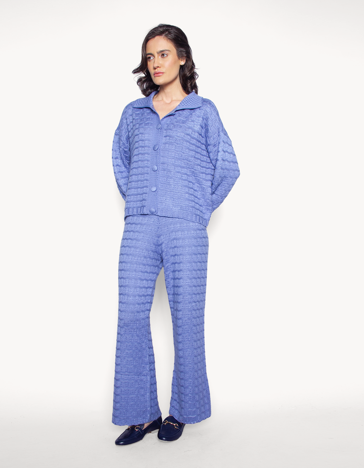 Conjunto tricot de blusa manga longa com fechamento em botões e calça pantalona com elástico na cintura. elegância encontra conforto neste conjunto de tricot, uma escolha refinada para qualquer ocasião.