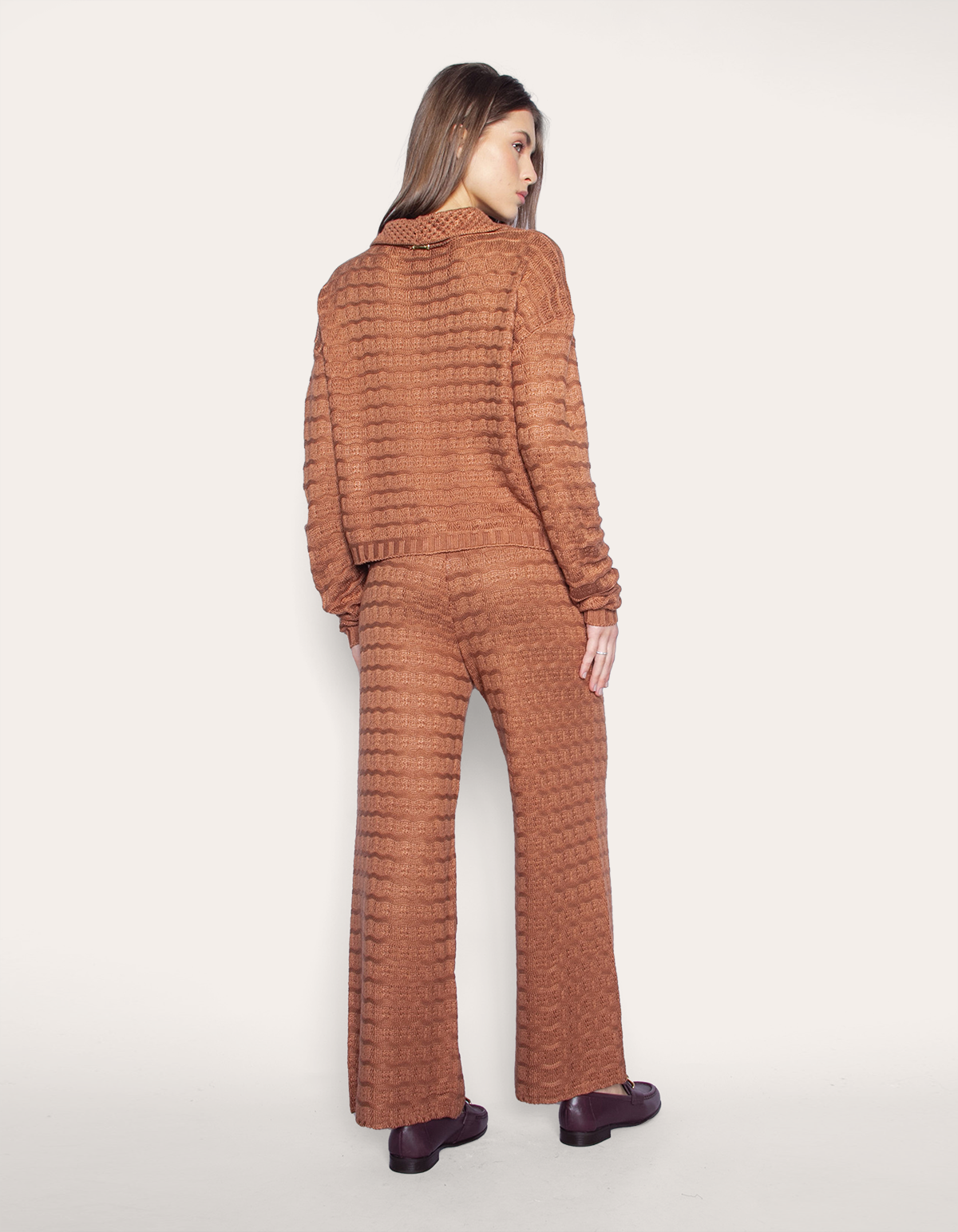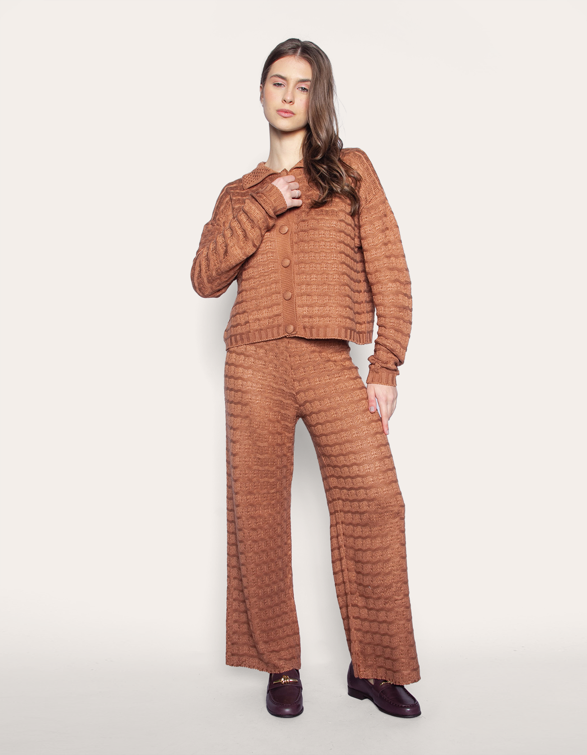 Conjunto tricot de blusa manga longa com fechamento em botões e calça pantalona com elástico na cintura. elegância encontra conforto neste conjunto de tricot, uma escolha refinada para qualquer ocasião.