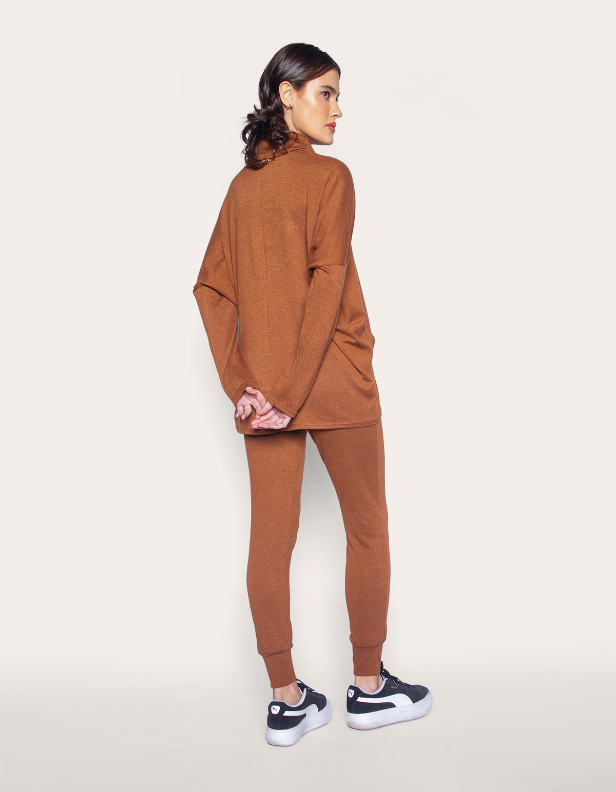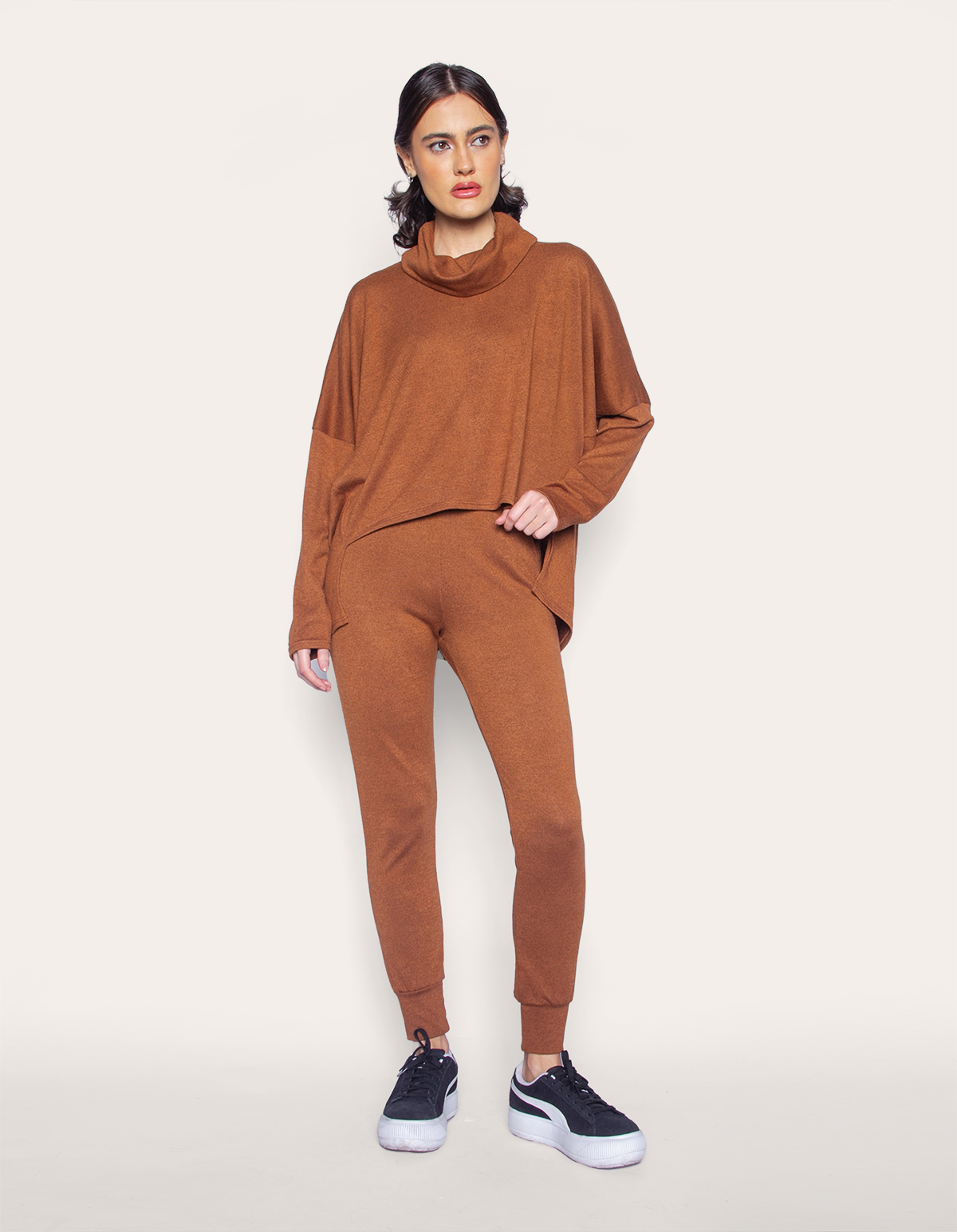 Apresentamos um conjunto que une conforto e estilo, composto por uma blusa de manga longa com modelagem ampla hi-lo e gola alta, junto com uma calça jogger. a blusa oferece um corte moderno e descontraído, enquanto a calça jogger proporciona comodidade e um toque esportivo ao visual. esse conjunto é perfeito para criar um look casual e contemporâneo, adequado para várias ocasiões.