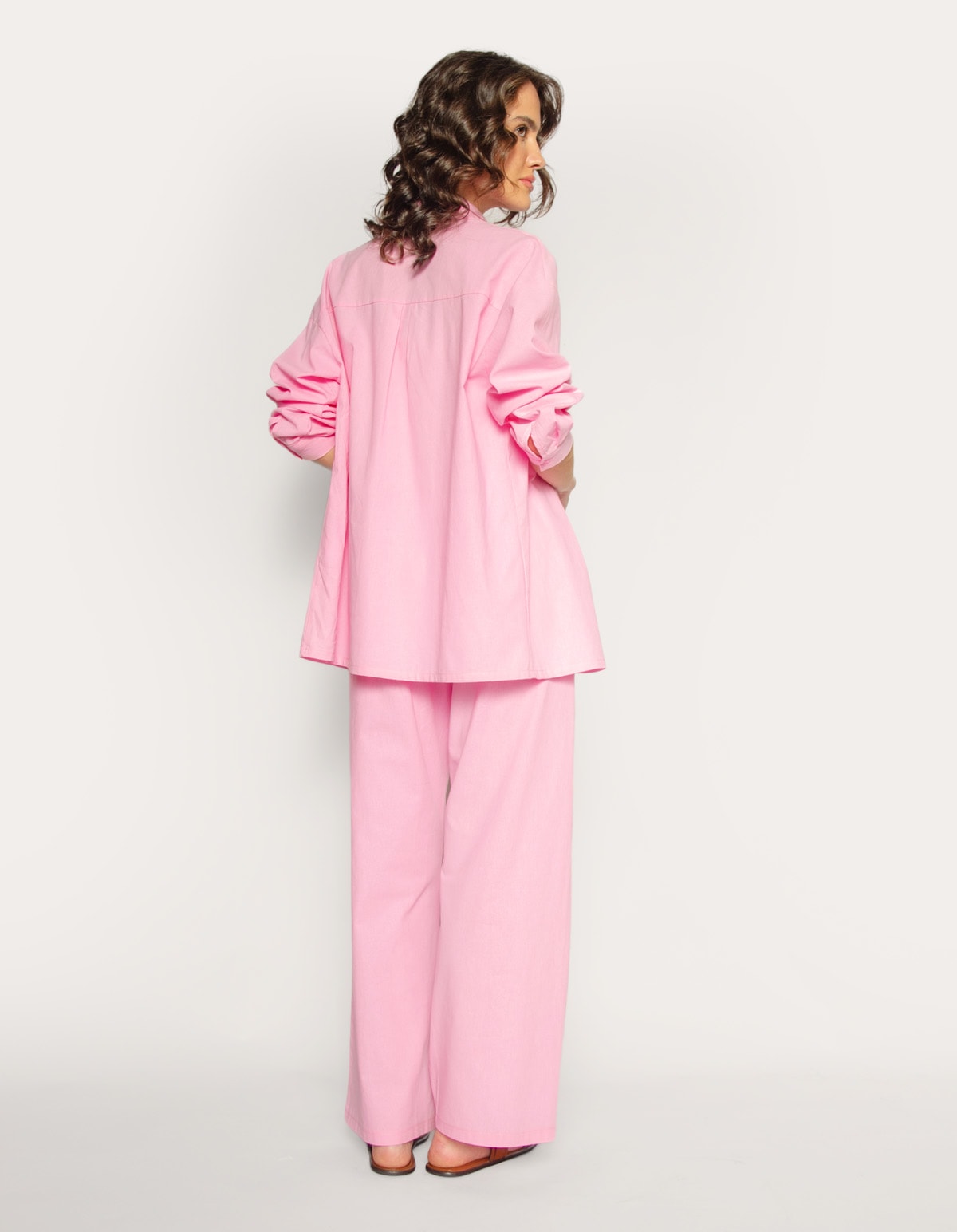 Conjunto de duas peças, composto por camisa manga longa gola tradicional de botões clássica e calça de pernas largas com cordão para ajuste de caimento reto e folgado, reforçando o visual confortável e relaxado.
